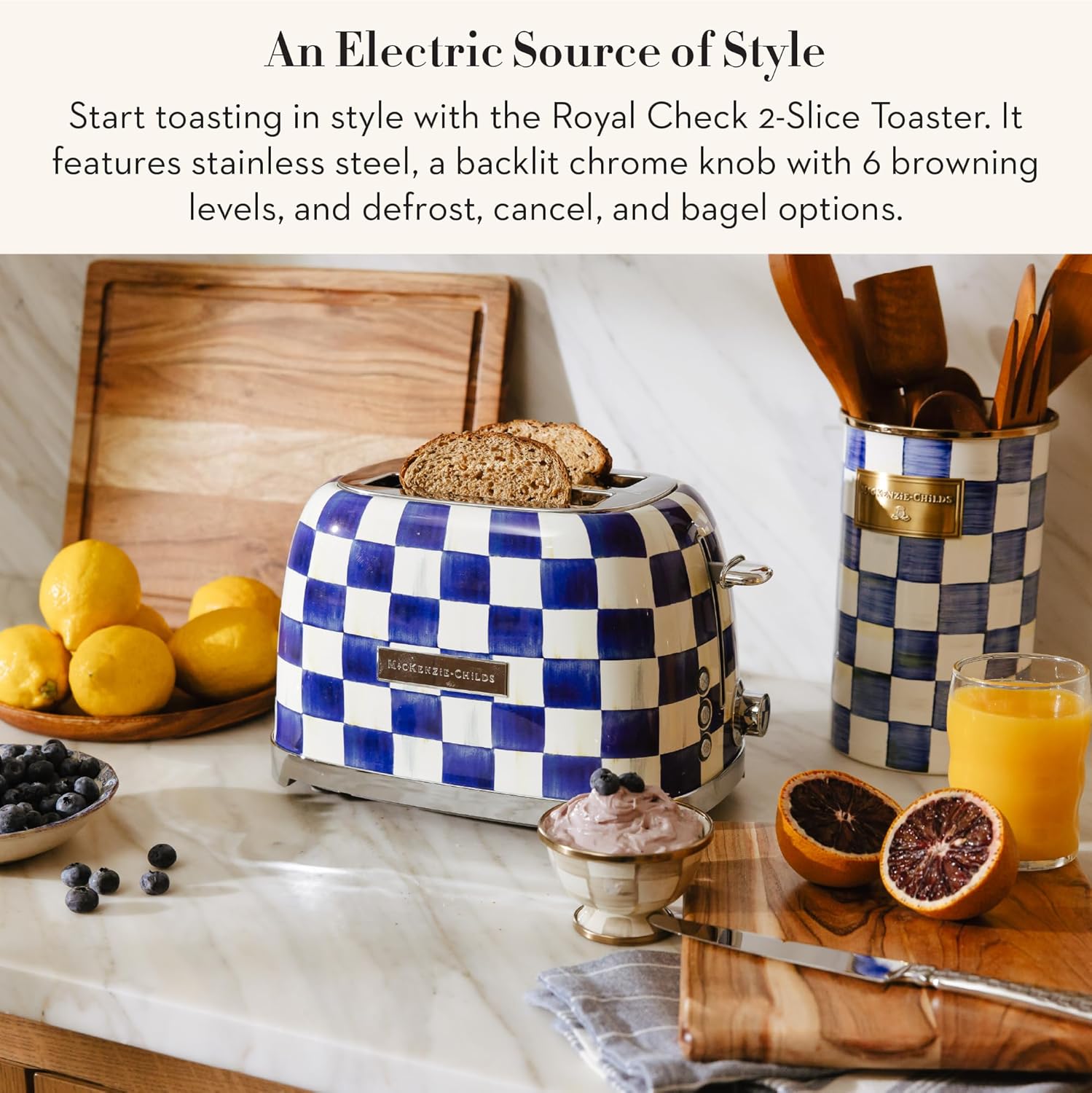 • ELEGANT KITCHEN DECOR: The Royal Check stainless-steel 2-slice toaster is a fun take on a must-have electronic appliance. This cute toaster features our regal blue -and-white checkered pattern with color-dragged accents that mimic brushstrokes.