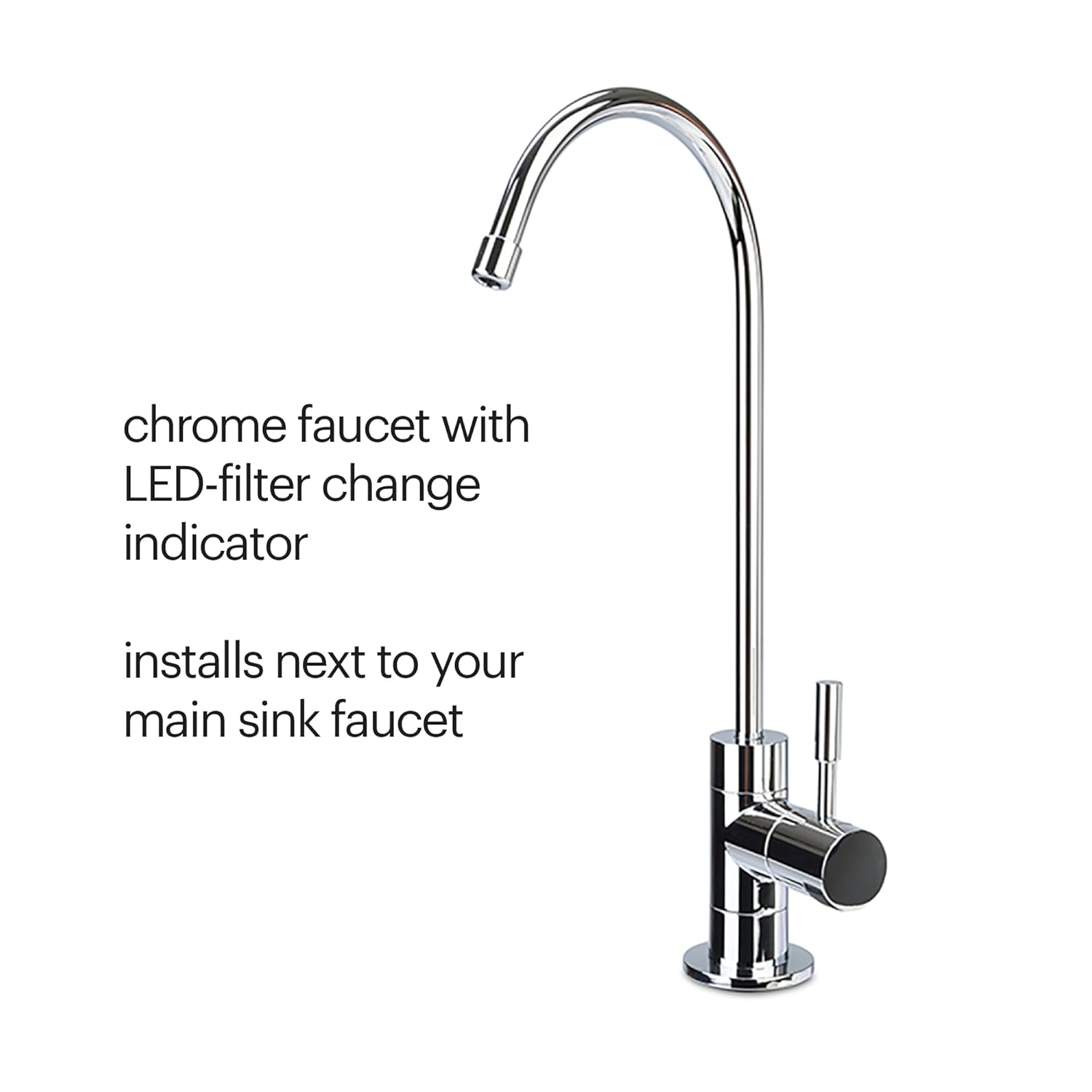 • DESIGNER FAUCET: This elegant, chrome kitchen faucet is the embodiment of quality and efficiency. The integrated LED filter change indicator conveniently reminds you when to replace your filters.