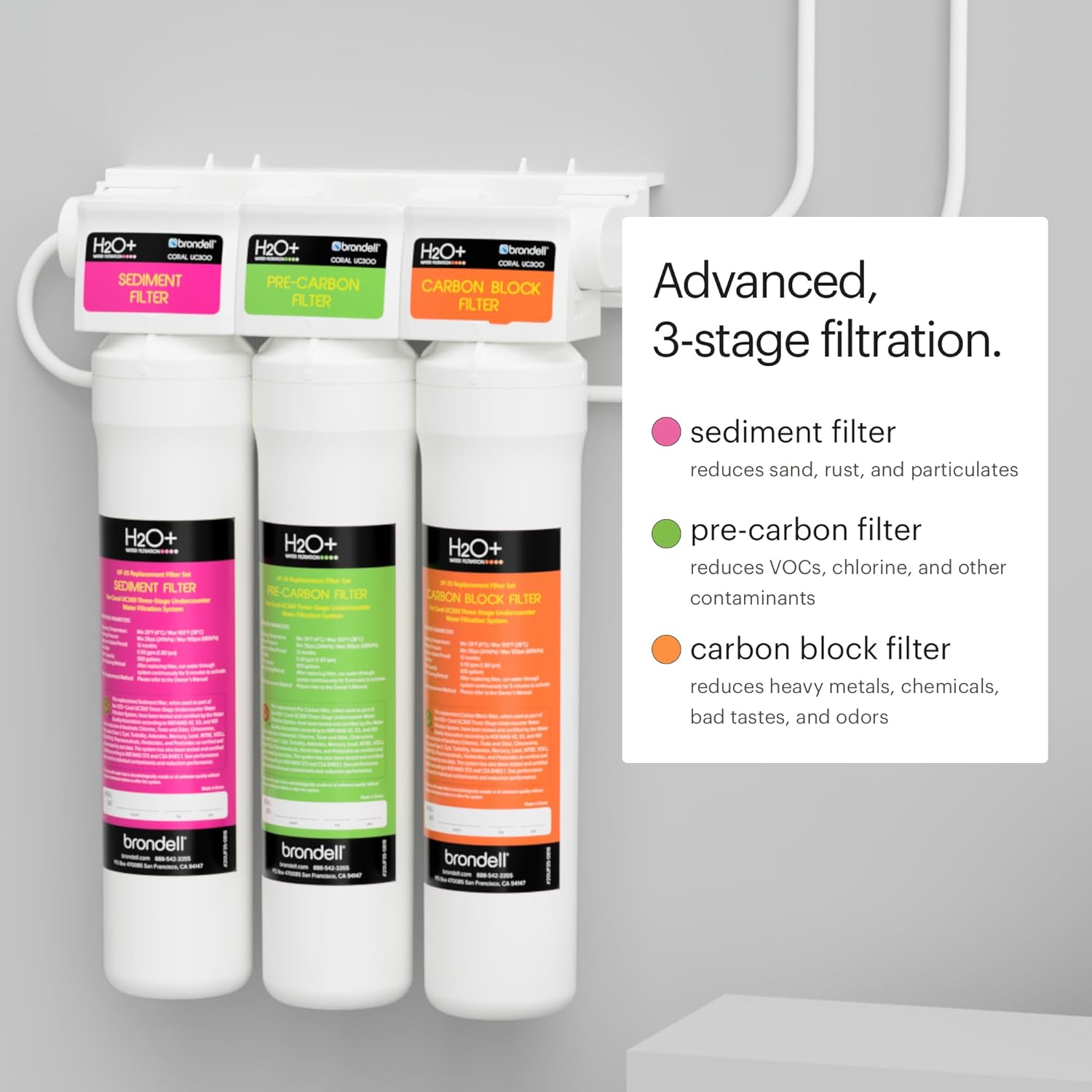 • THREE-STAGE FILTRATION: Brondell’s Coral Three-Stage filter set consists of a sediment filter, pre-carbon filter, and carbon block filter. Get rid of physical, chemical, and biological contaminants in your water while leaving behind beneficial minerals.