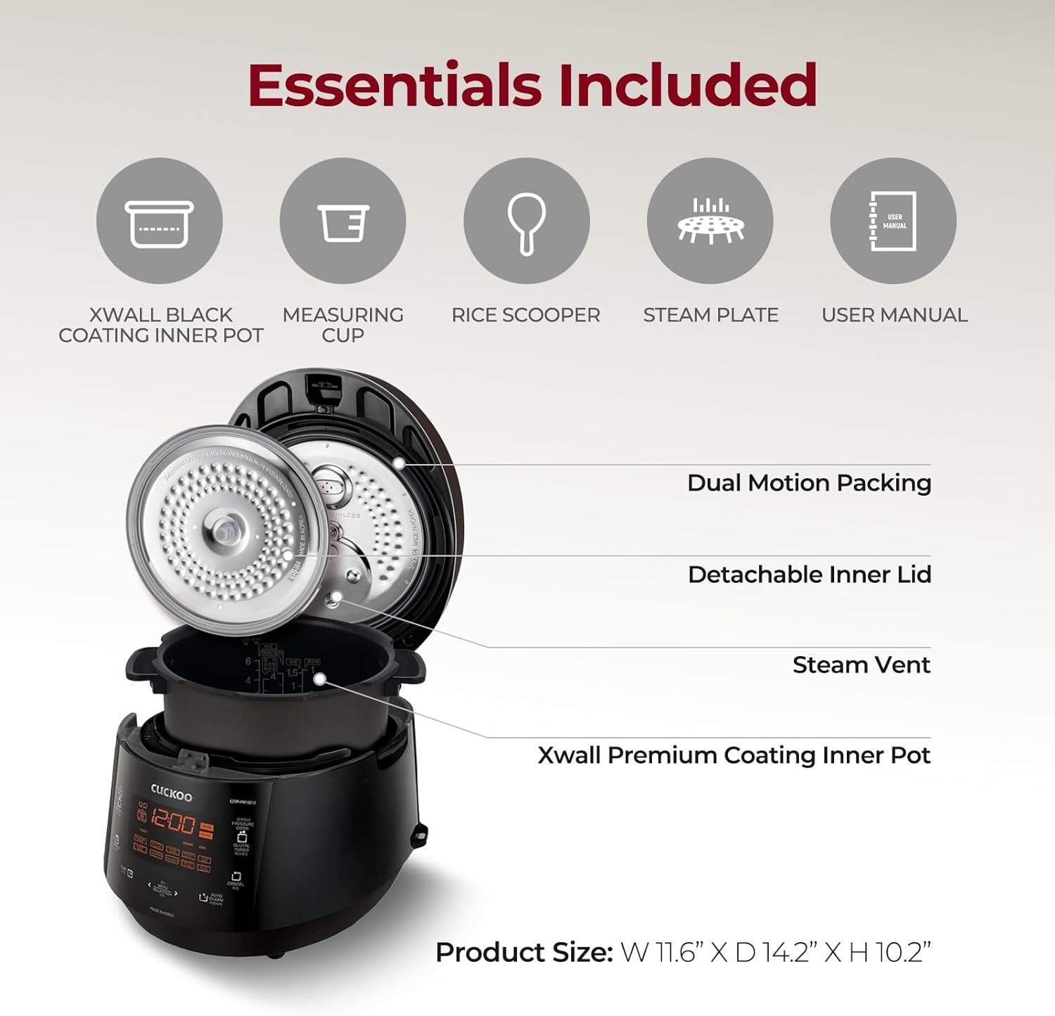 CUCKOO High Pressure Rice Cooker 6-Cup Uncooked / 12-Cup Cooked with Nonstick Inner Pot, Versatile Rice Maker with 12 Menu Options and Steam Plate, Fuzzy Logic Tech, Voice Guide, Black (CRP-P0609S)