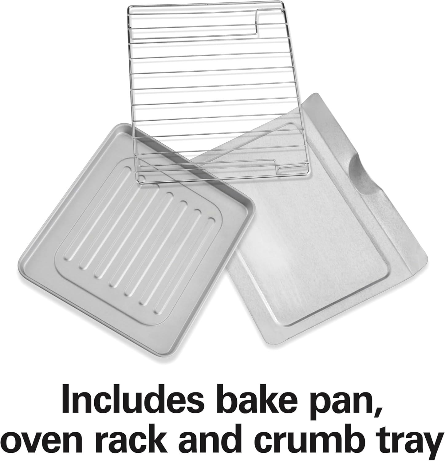 • INCLUDES ACCESSORIES: The oven has 2 rack positions and comes with a bake pan for toasting and baking, an oven rack for broiling and a slide-out crumb tray. When broiling foods on the oven rack, the bake pan rests on the supports below to catch drippings.