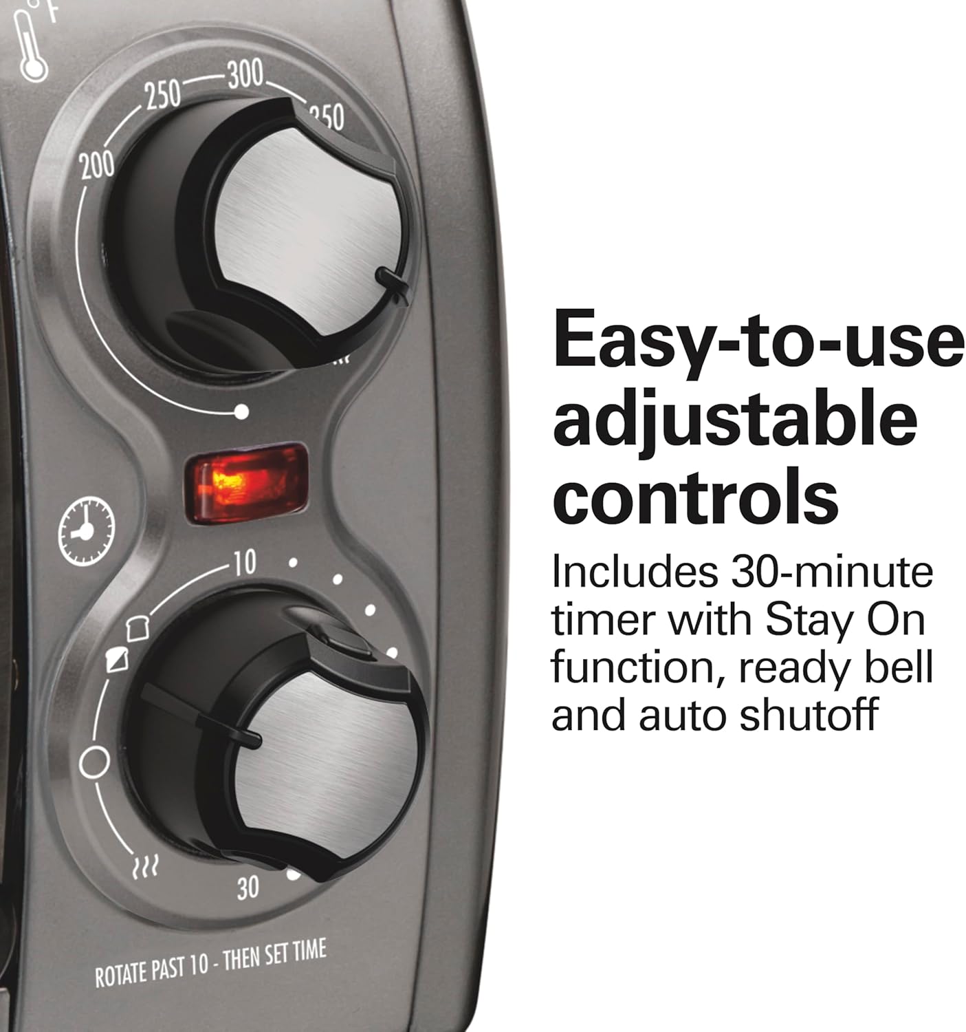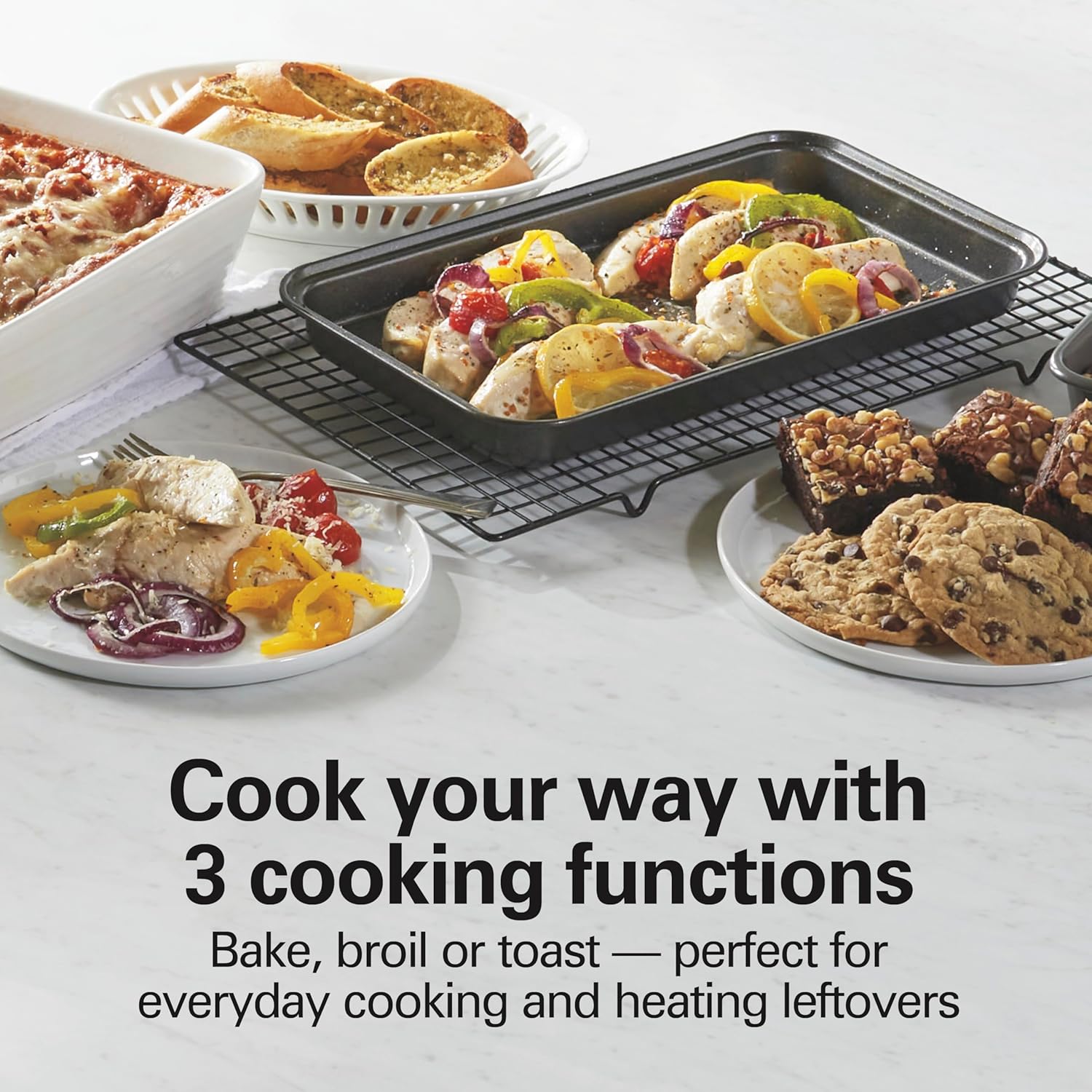 • SPACIOUS INTERIOR — FITS 4 SLICES OF TOAST OR A 9" PIZZA: This Hamilton Beach toaster oven has room for cooking everything from snacks and side dishes to complete sheet pan meals.