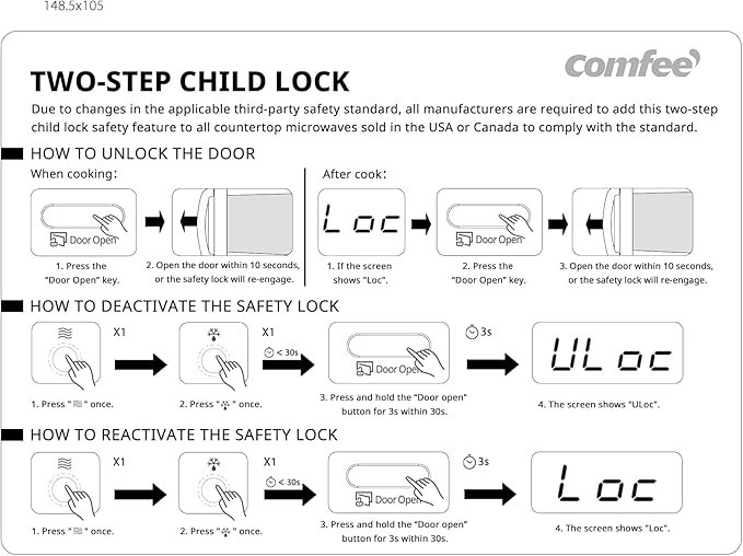 • Large LED digital display, easy-to-read control panel, child safety lock, interior light, removable 10” glass turntable
