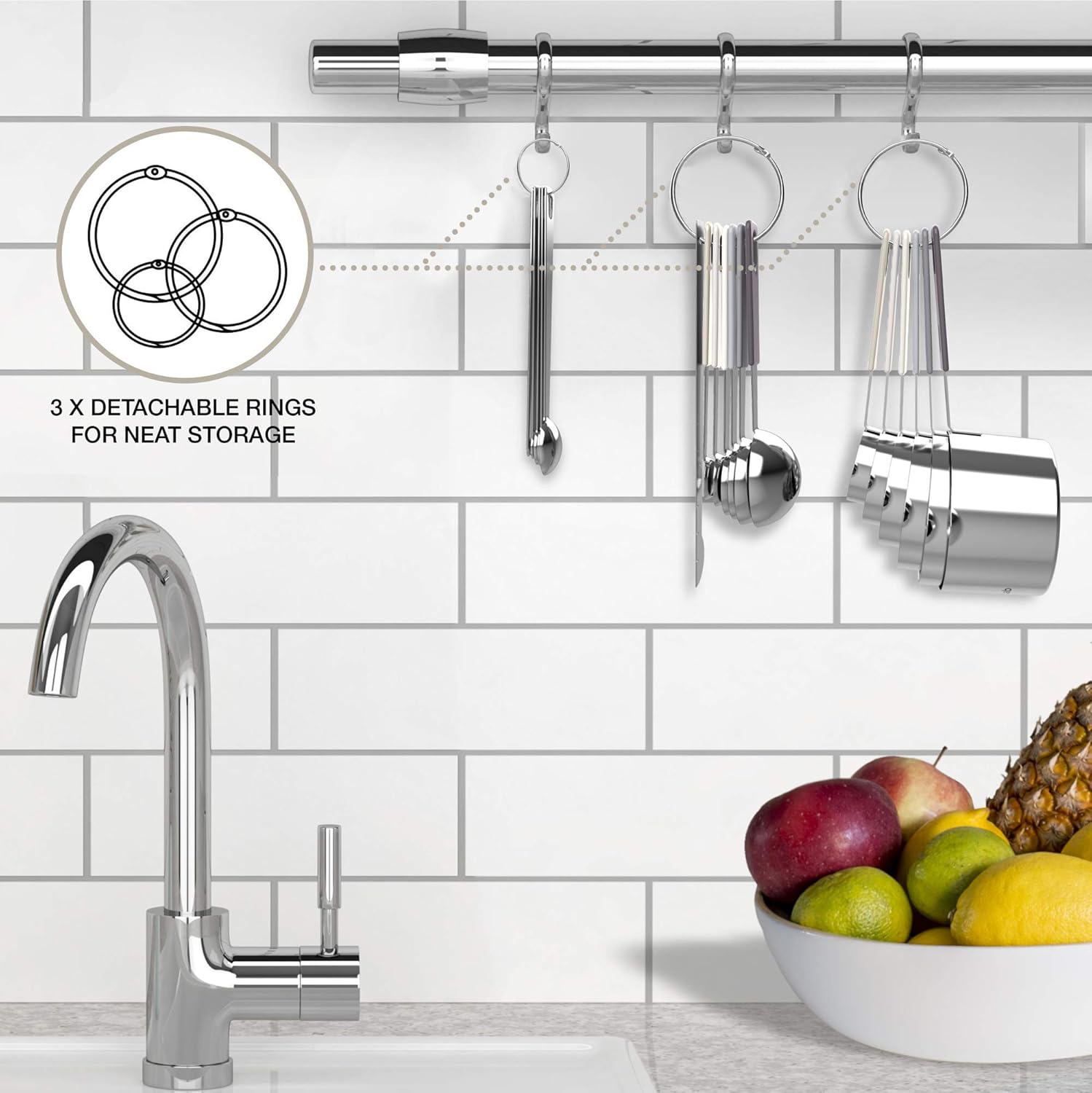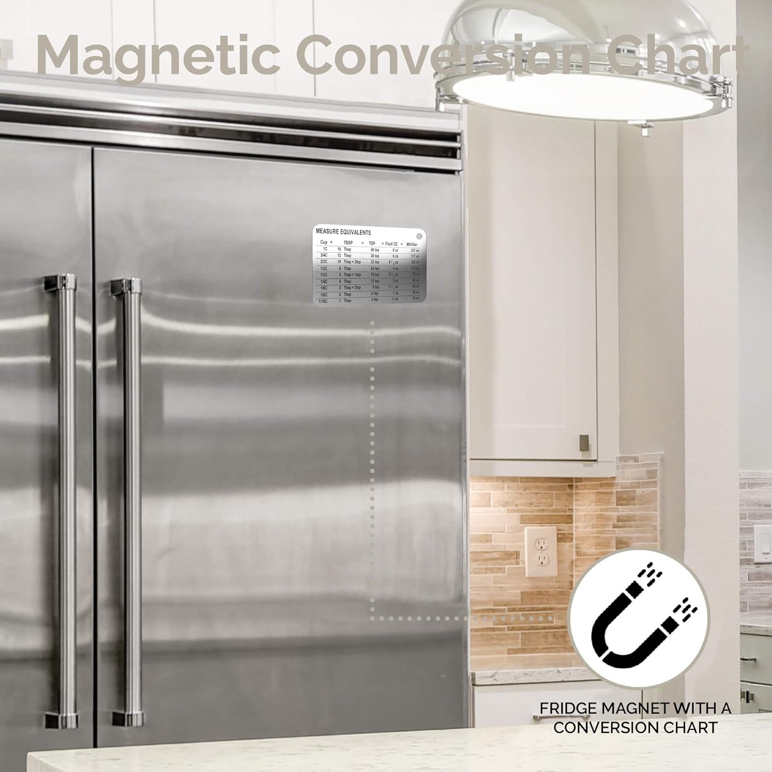 • The only set you will ever need - This versatile set of 22 pieces include: * 6 measuring cups (1/8 cup, 1/4 cup, 1/3 cup, 1/2 cup, 3/4 cup, and 1 cup) * 6 measuring spoons (1/8 tsp, 1/4 tsp, 1/2 tsp, 1 tsp; 1/2 tbsp and 1 tbsp) * 5 mini-measuring spoons (drop, smidgen, pinch, dash, and tad) * 1 cup- or spoon-leveling tool with mini-ruler * 1 fridge-magnet conversion chart * 3 round hinged rings. Whatever measurement you need, we got you covered.
