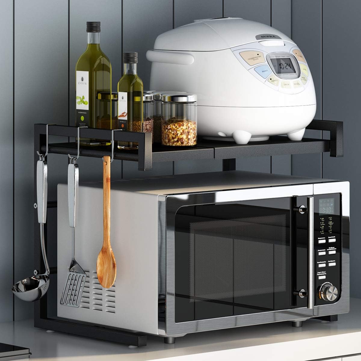 • Multi-Function! Made by durable thick carbon steel, also painted by ecological black paint, heat resistant and anti-rust. This microwave shelf rack is suitable for your kitchen, and any other storage areas such as shower room, wardrobe, garage, etc. It comes with 3 bonus hooks to store oven mitts, kitchen utensils, or hand towels