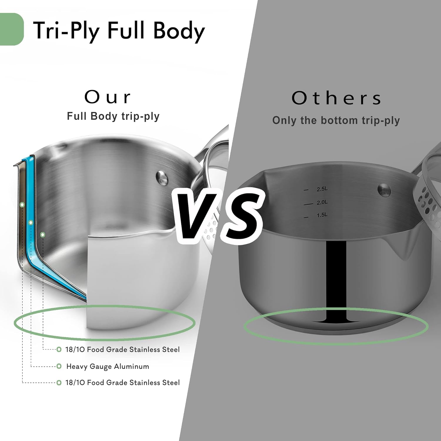 3.5 Quart Stainless Steel Pot Saucepan with Glass Strainer Lid, Sauce Pot with Two Side Spouts, Induction Cooking Pot, Multipurpose Sauce Pan with Lid for Cooking(Tri-Ply Full Body)