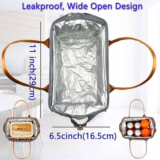 • ✿ Wide-Open Design & Large Size: Our women bag can be opened up to 11"L x 6.5"W by dual zipper closure, you can put into or take out of your lunch or other kinds of stuff horizontally, avoid spilling soup or liquid in the bag. The dimension is:11” L×6.5” W×11” H,it could give roomy storage space you need to hold your favorite meals, delis, and lunch treat. You could fill the compartments or pockets with lunch boxes, food containers, condiments, fruit salad bowls and other essentials.