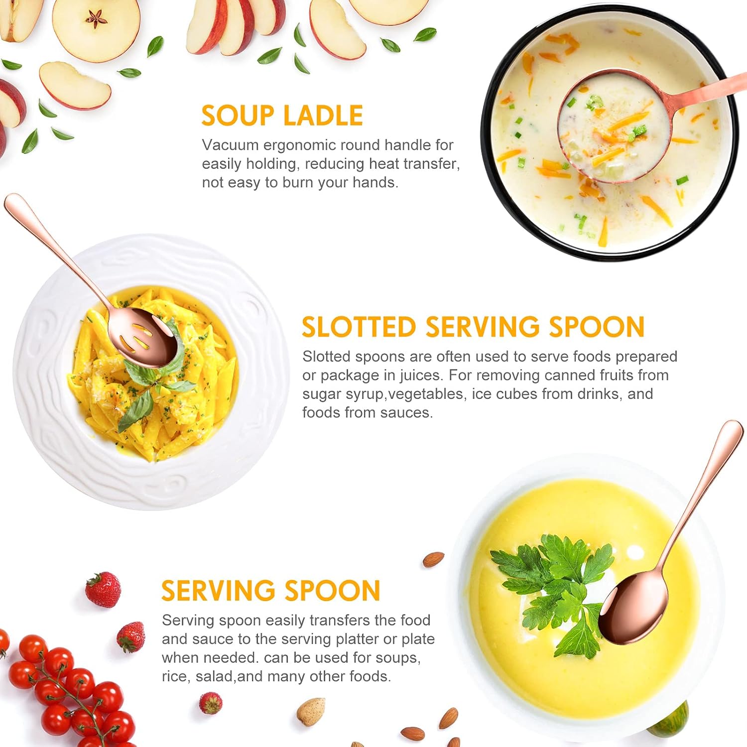 • Serving Utensils Set: includes serving spoons, serving forks, the quantity is for you to choose, this service combination will be very suitable for serving food, cooking food, distributing solid food, picking up food and filtering food residues in juice