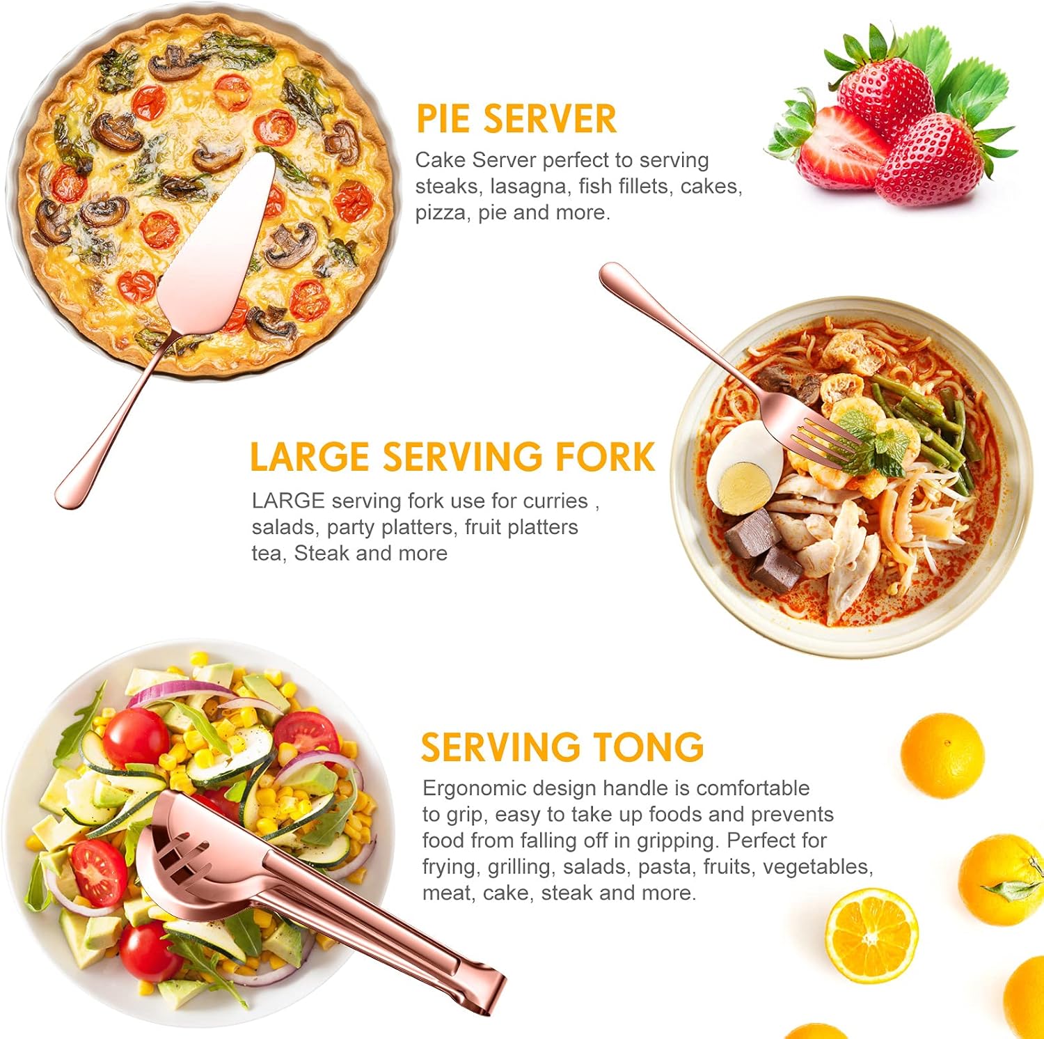 • Humanized Design: smooth humanized handles of these pie server, soup ladle, serving spoon, slotted spoon and fork make serving easy, proper size and nice weight ensure comfortable hand feel; The serving tong also comes with humanized design, proper long handle makes it easy to pick up food