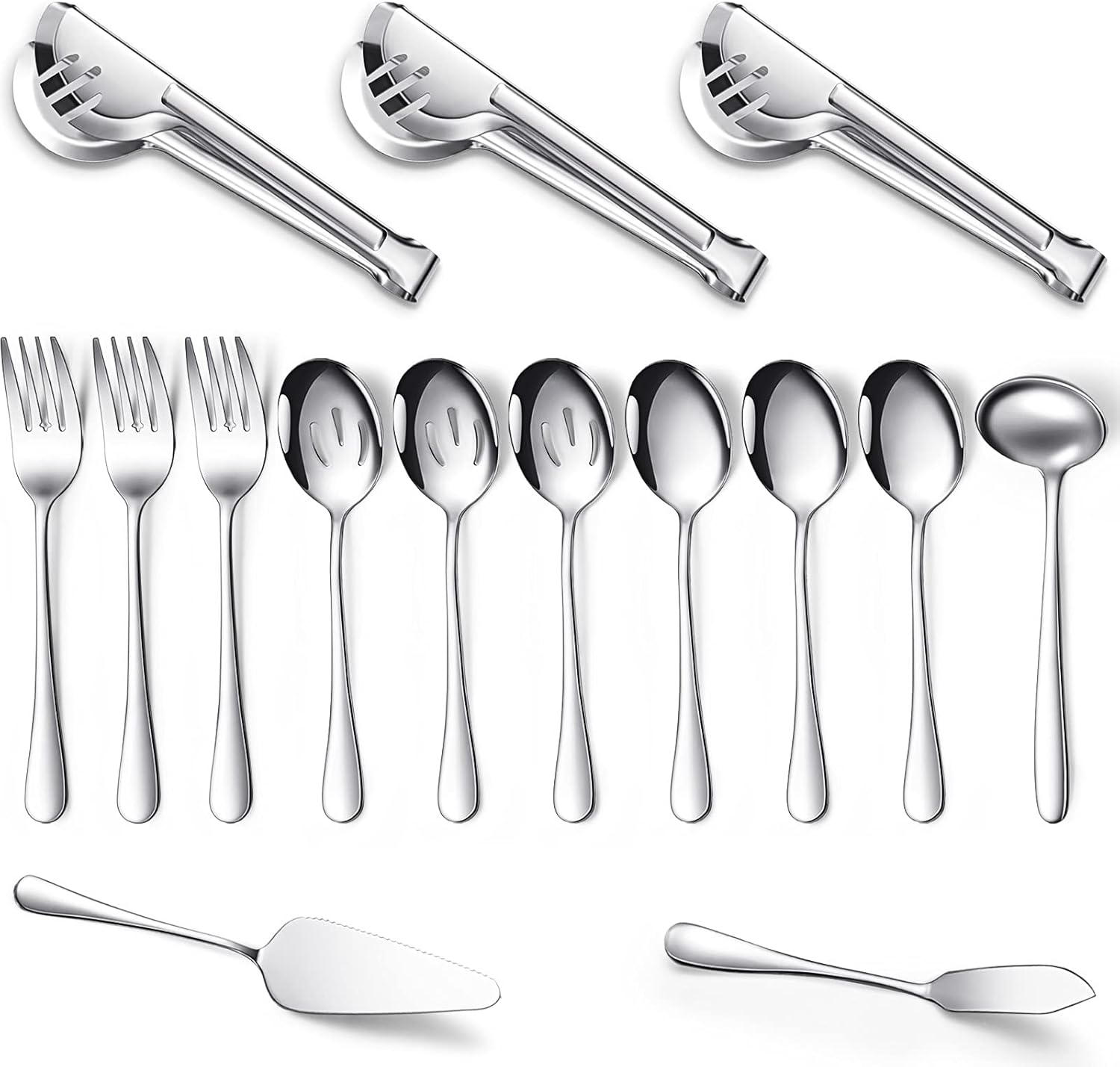Patelai Serving Utensils Set Include Stainless Steel Large Spoons Slotted Spoons Forks Tongs Soup Ladle and Pie Server for Parties Buffet Catering, Dishwasher Safe(Silver,15 Pieces)