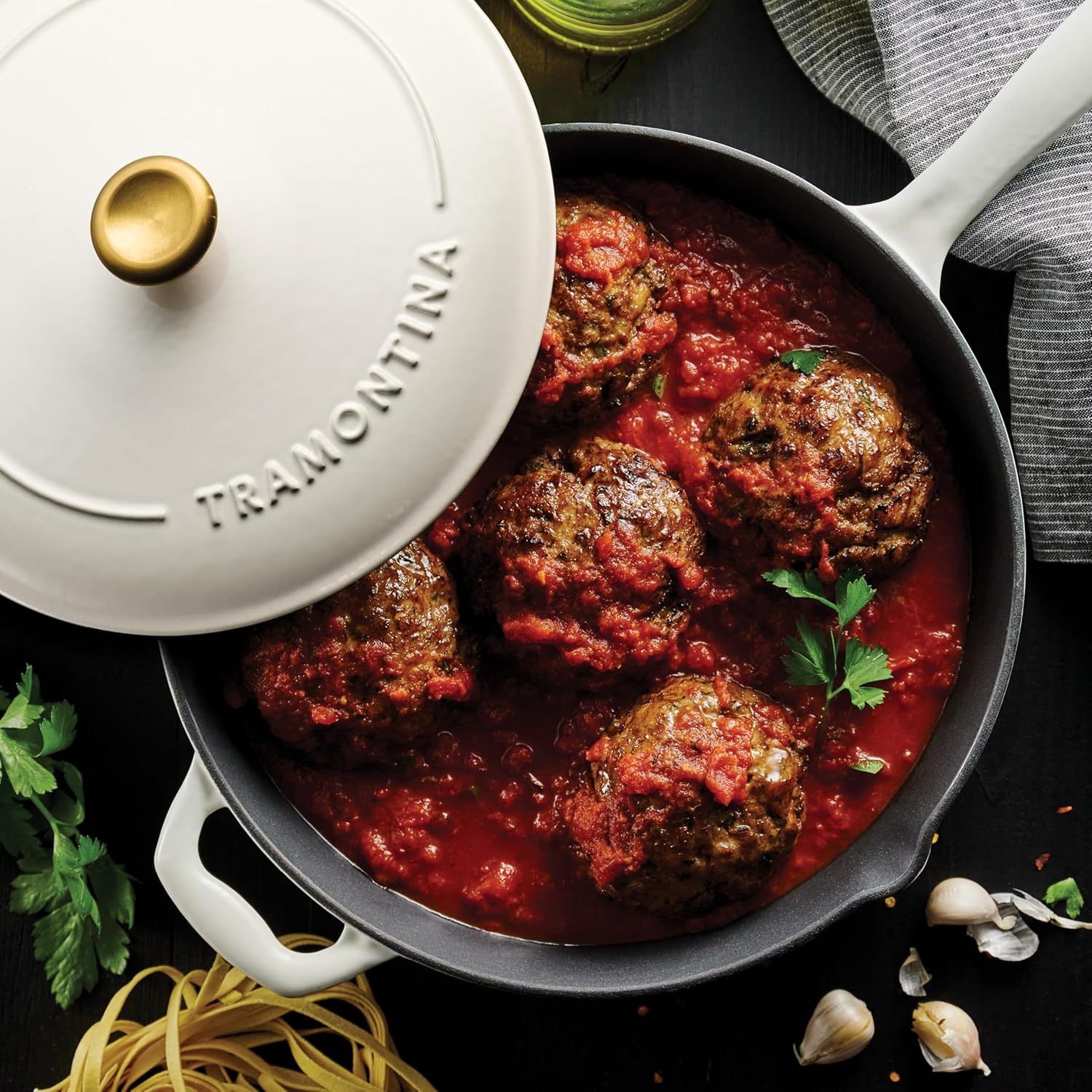 Tramontina Bestow Enameled Cast Iron Skillet with Lid, 12-inch Frying Pan, Latte with Gold Knob