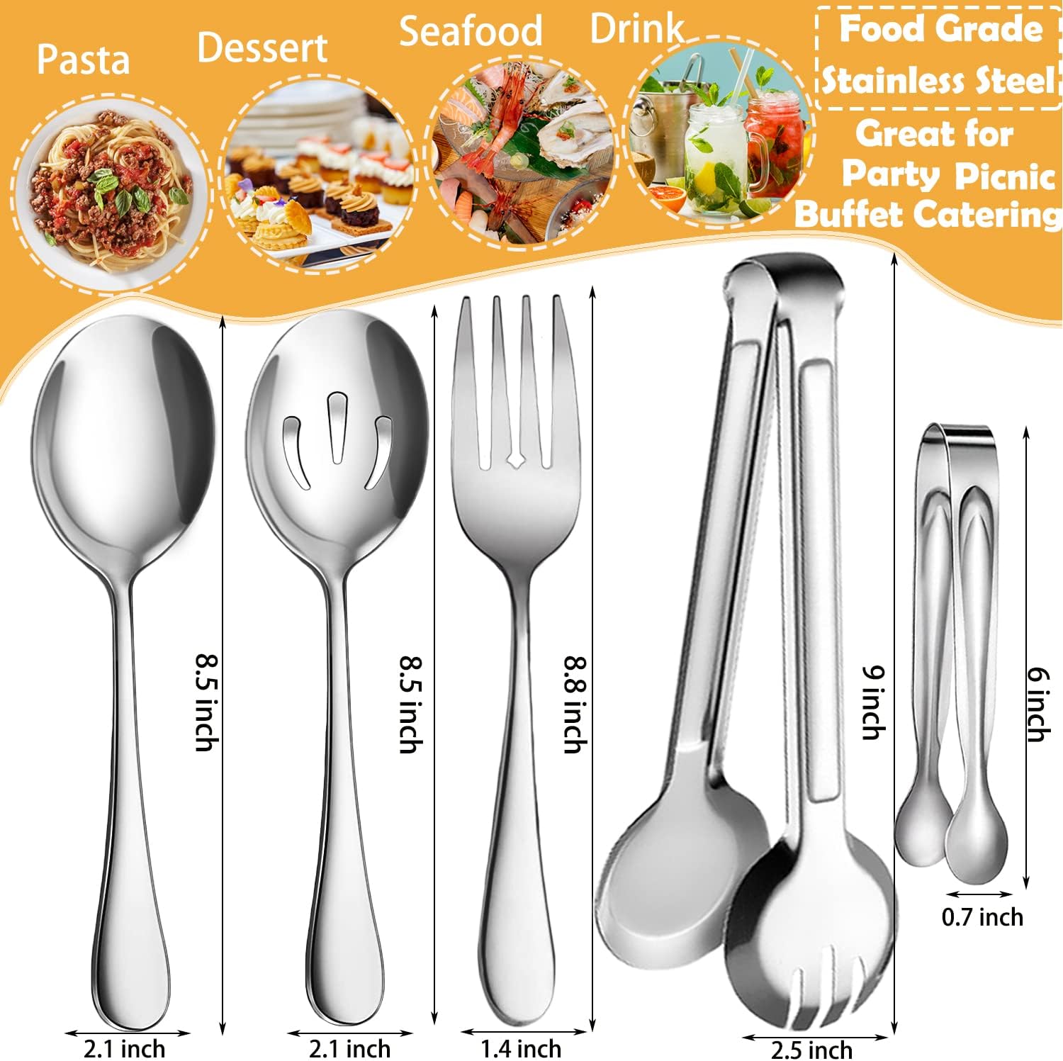 • 【Optimal Size】The large serving tong measures approx. 9.4 inches in length, and the other small serving ice tongs measure approx. 6 inches. The serving spoons measure approx. 8.5 inches in length and the serving fork is about 8.8 inches in length, suitable for all the gatherings, parties, and buffets, and they serves well on catering, barbecue, wedding, celebration, banquet, holiday meal, potluck, home, restaurant, hotel, etc.