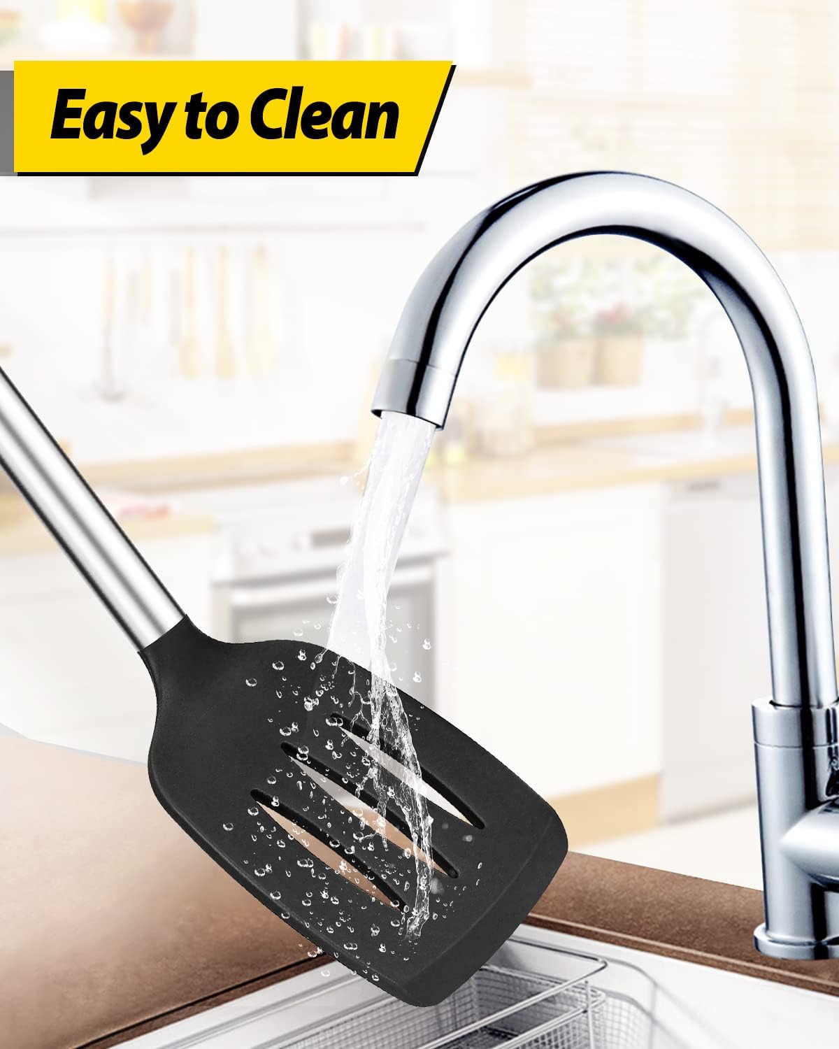 Pack of 4 Silicone Cooking Utensils Set, Non Stick Large Solid Spatulas, Heat Resistant Black Slotted Spoons, Ideal BPA Free Kitchen Turners for Frying, Mixing,Serving,Draining,Turning,Stirring