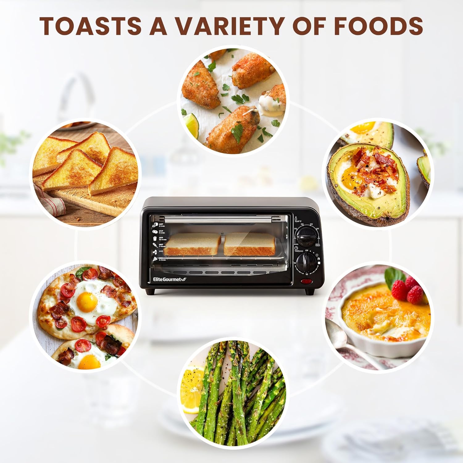 Elite Gourmet ETO236 Personal Compact 2 Slice Countertop Toaster Oven with 15 Minute Timer & Adjustable Temperature, Bake, Broil, & Toast, Black