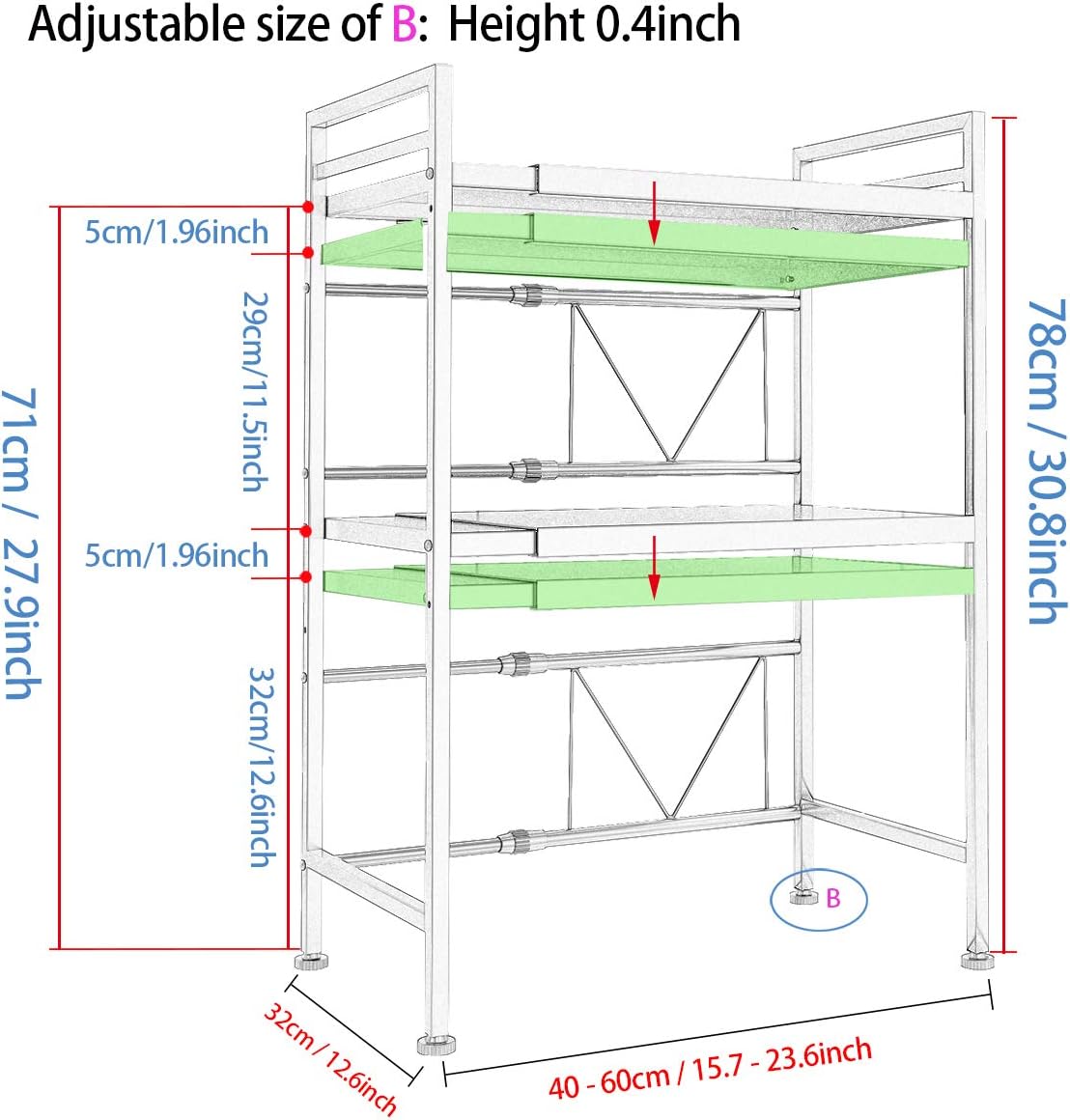 • - Expandable & height adjustable: The length of this microwave rack can be adjusted from 15.7-23.6 inches (40cm-60cm) and its height can be adjusted by choosing from different holes. This allows you to customize its size to fit your needs and save space in your kitchen.