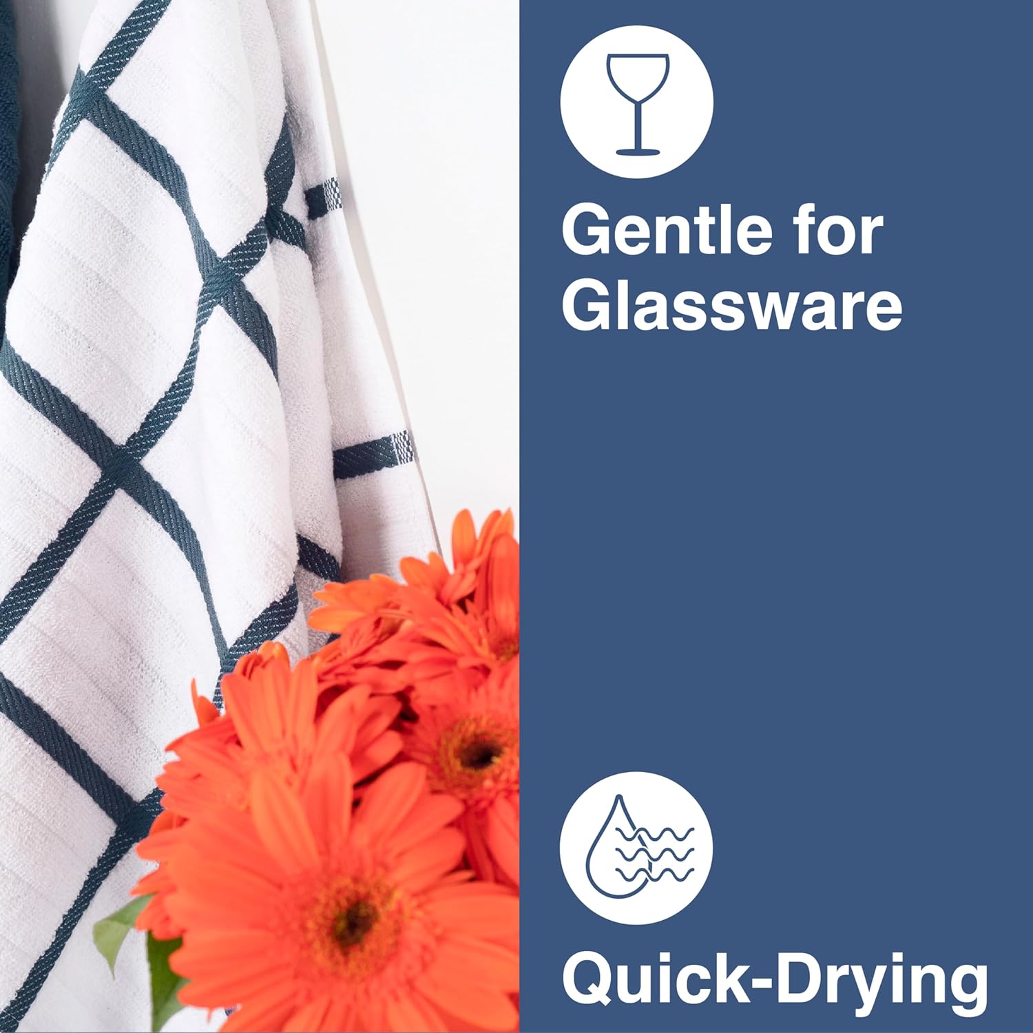 • 100% COMBED COTTON. Extra soft pre-washed, yarn-dyed cotton with finished stitched hems. Made of highly absorbent soft cotton that makes them great for drying dishes and glassware and cleaning up spills around the kitchen