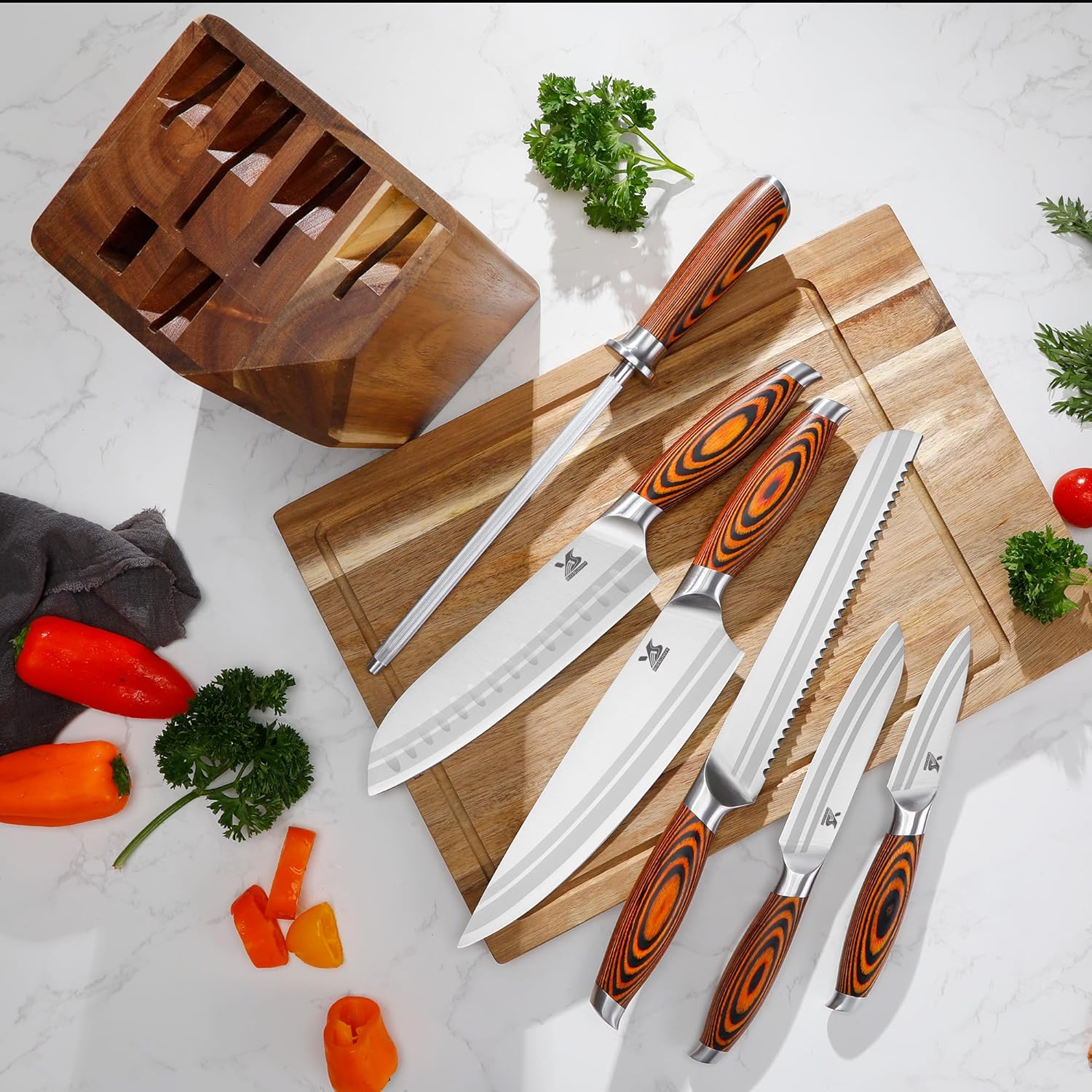 • 【Well-Designed Knife Set】Includes: 1*chef knife, 1*bread knife, 1*santoku knife, 1*utility knife, 1*fruit knife, 1*Honing steel, 1*Knife Block. These blades will provide you with the perfect, clean separation you’ve been searching for slicing, precise peeling, filleting, skinning and trimming. It is essential for any serious chef.