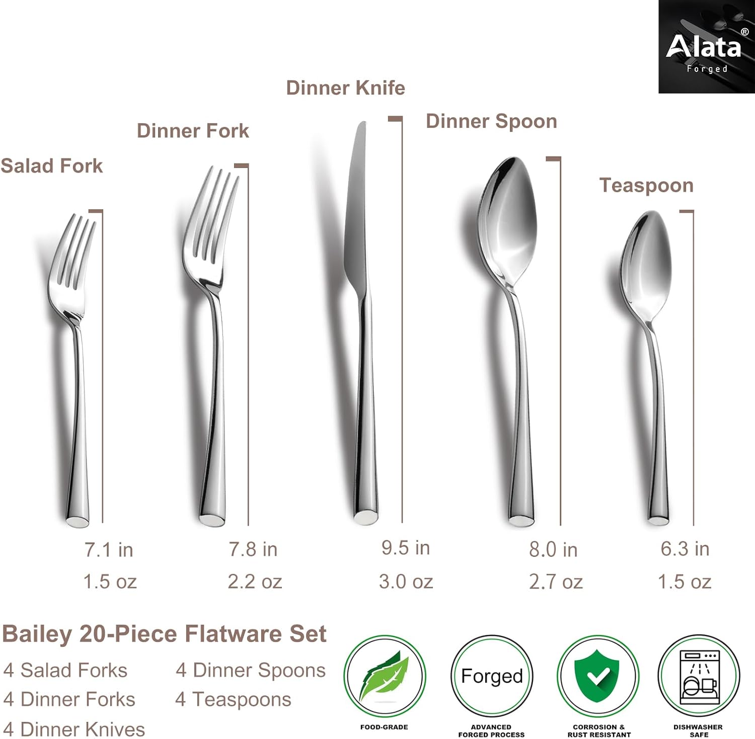 Alata Bailey 20-Piece Forged Silverware Set Stainless Steel Flatware Set,Service for 4,Mirror Polished Cutlery Set,Dishwasher Safe…