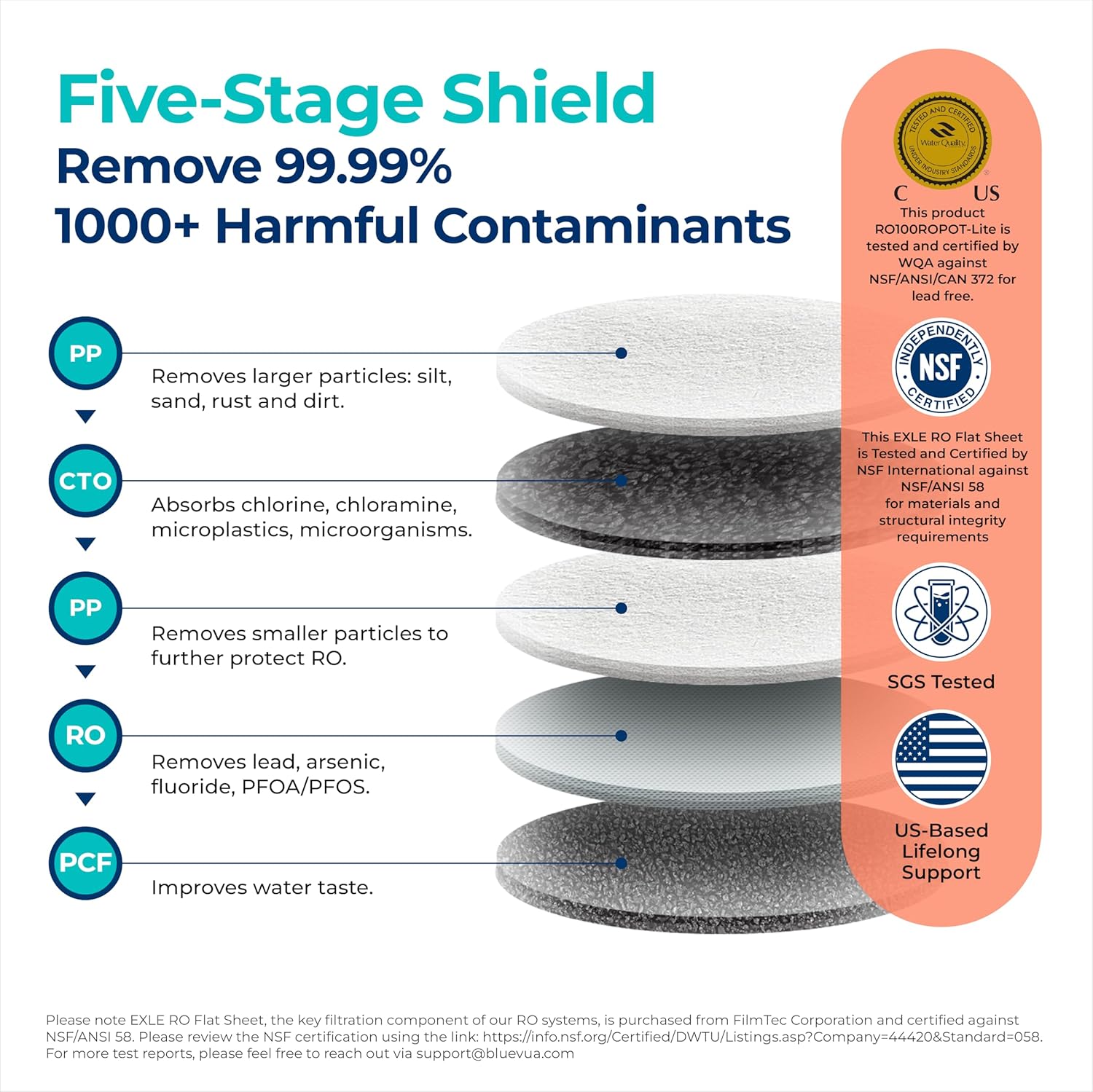 • SPACE-SAVING DESIGN + YEARLY MAINTENANCE: The ROPOT-Lite offers a compact 5-stage filtration system, perfect for 1-2 people, with easy annual filter replacement. Certified by WQA against NSF/ANSI/CAN 372 for lead-free and tested by SGS, it uses a 0.0001μm RO membrane to effectively reduce harmful contaminants, including TDS, PFOA, PFOS, Chlorine, Fluoride, Arsenic, Lead, and more. Enjoy pure, healthy water that fits seamlessly into your living space.