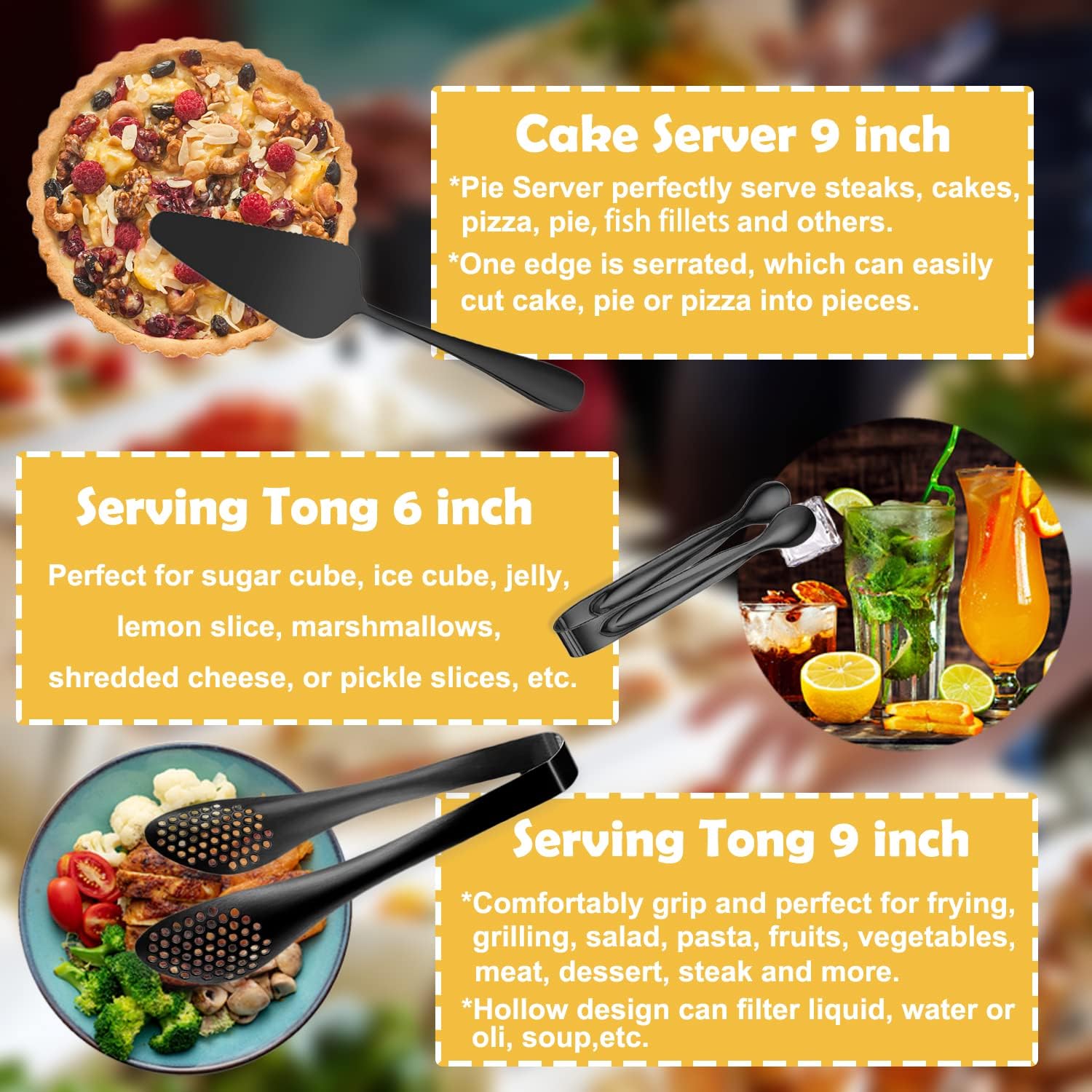 • 【Multiple Applications】The practical 9 inch tongs are capable of flipping breads burgers or fish, grilling meat or as salad tongs. The other 6 inch small tongs are suitable for serving sugar cube, ice cube, jelly, lemon slice, marshmallows or pickle slices, etc. The slotted spoon and fork can removed the solid food in the liquid and the solid spoon without holes are optimal for stirring and serving food with a thick sauce. Pie Server perfectly serve steaks, lasagna, cakes, pizza, pie and others.