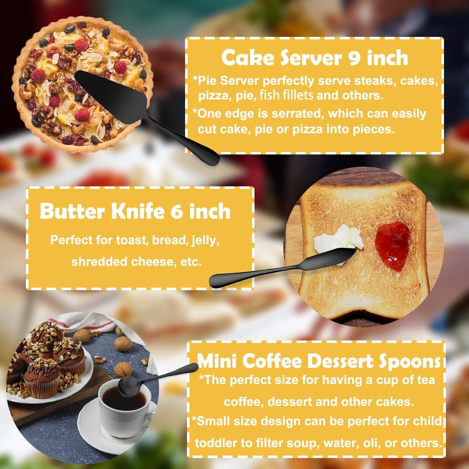 • 【Multiple Applications】The practical 9 inch tongs are capable of flipping breads burgers or fish, grilling meat or as salad tongs. The other 6 inch small tongs are suitable for serving sugar cube, ice cube, jelly, etc. The slotted spoons, solid spoons and forks can removed different food in the liquid or with a thick sauce. Pie Server perfectly serve steaks, pizza, pie and others. The butter knife and small spoons are great for breakfast, high tea with toast and coffee.