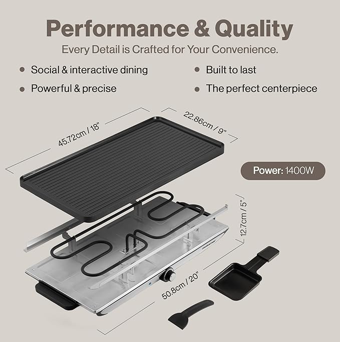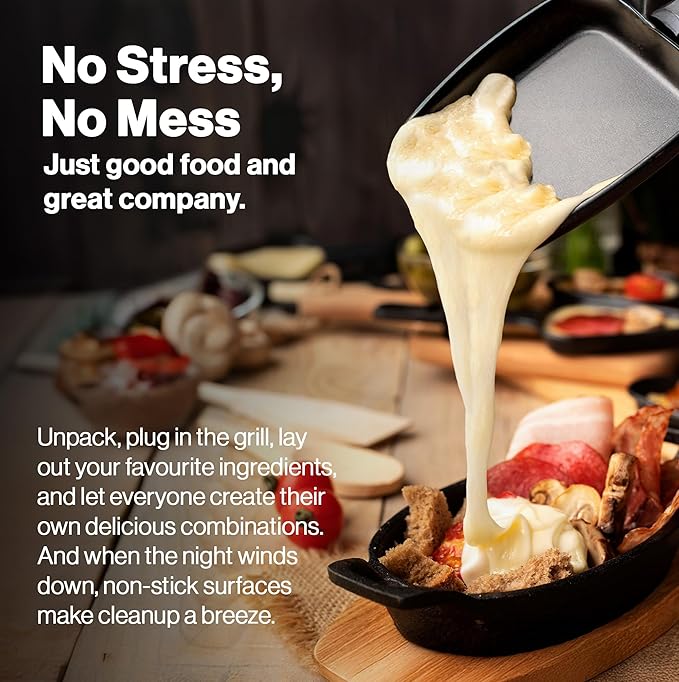• Versatile Raclette Basics: Grill thinly sliced meats and vegetables on the reversible aluminum grill top while melting cheese in the raclette dishes below. Use the heat-resistant spatulas to scrape the melted cheese onto your meats, vegetables, or pre-boiled potatoes for a delicious, customizable meal. This raclette grill is perfect for indoor or outdoor dining year-round.