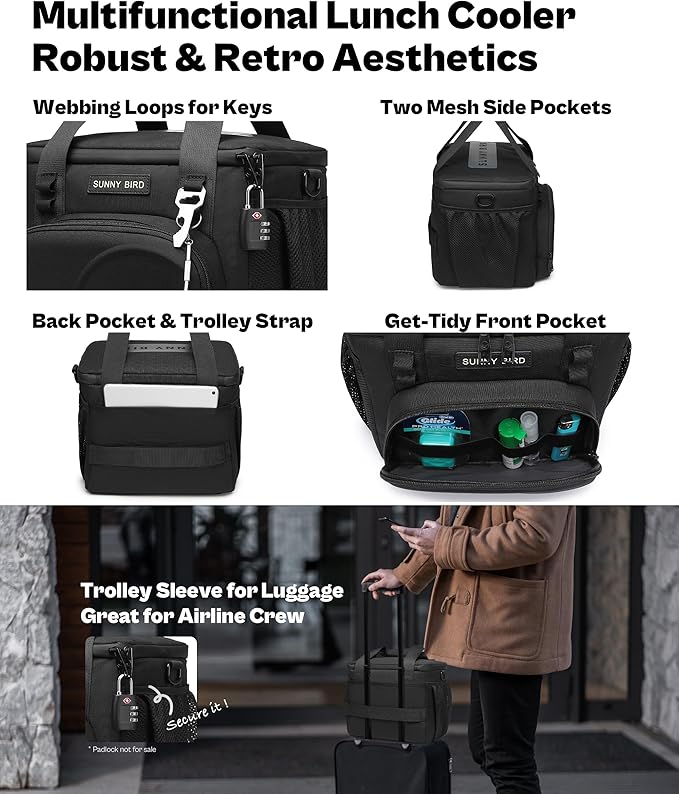 • [Stylish Design and Multifunctional] The aesthetics and functional details make SUNNY BIRD lunchbox feel more retro. The engraved hard shell on the front pocket and the bag lined with sleek ripstop fabrics lend the lunch box a hip and sporty vibe. Plus, a trolley strap for luggage, 4 webbing loops for attaching keys and other small essentials and duo metal zippers to secure your food