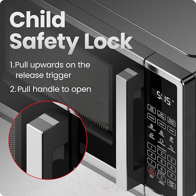 • SAFETY LOCK: Childproof lock mode prevents the microwave from being started. Hold the STOP/CANCEL button for 3 seconds to turn on and off