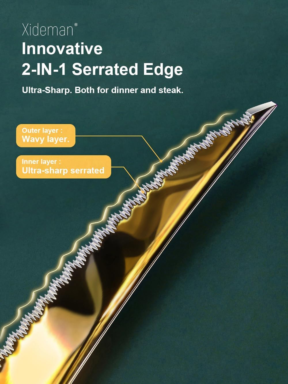 • Included Components : 4 ultra-sharp 2-in-1 serrated knives, 4 dinner fork, 4 dinner spoon, 4 coffee Spoons / mini teaspoons 4 ultra-sharp 2-in-1 serrated knives, 4 dinner fork, 4 dinner spoon, 4 coffee Spoons / mini teaspoons