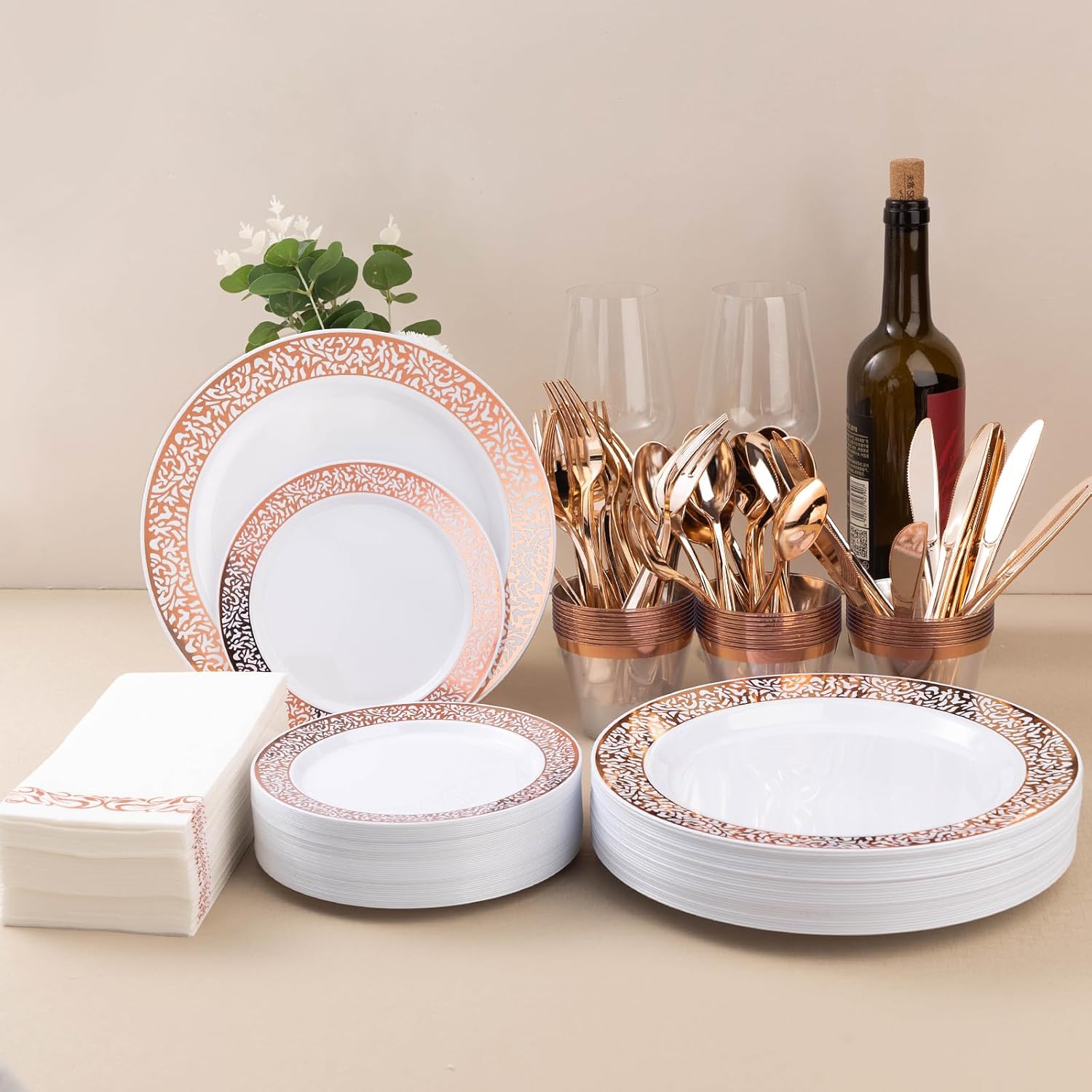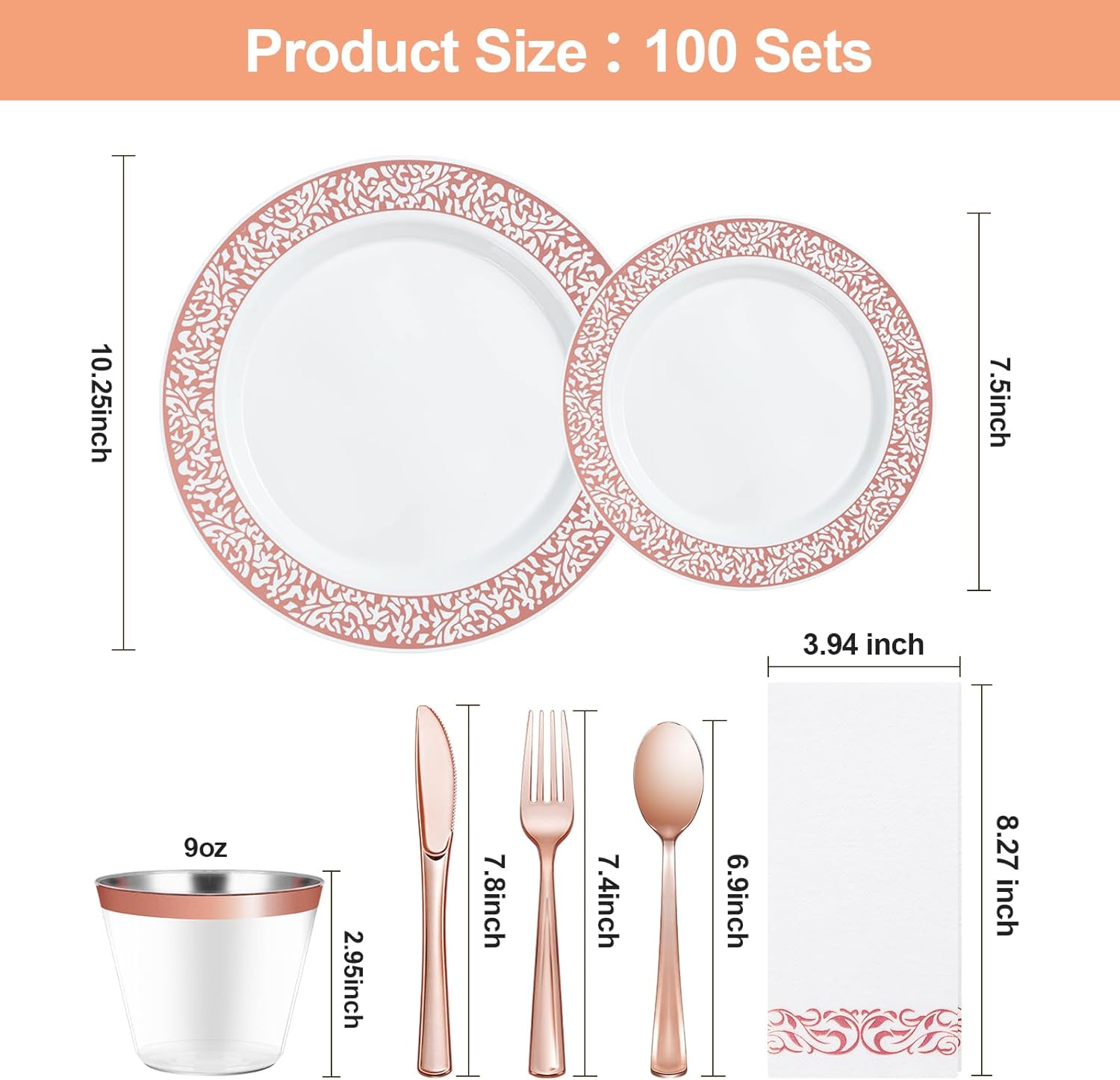 700PCS Rose Gold Plastic Dinnerware Set for 100 Guests, Disposable Plates for Party, Wedding, Include 100 Rose Dinner Plates, 100 Dessert Plates, 100 Set Silverware, 100 Cups, 100 Napkins