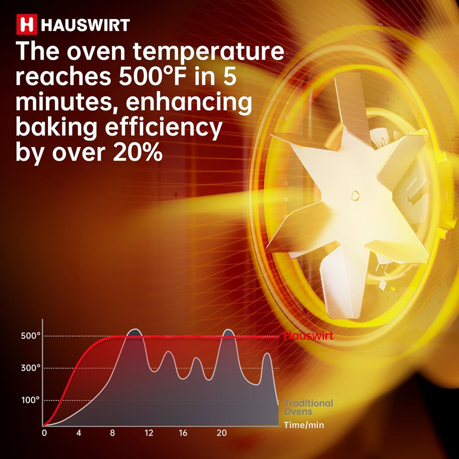 • 【Crispier and Healthier】Use a back fan for the best texture. Its 6 whirlwind blades and 1800W power, along with 5 infrared heating tubes, generate high-temperature airflow, boosting baking efficiency. Hauswirt Convection Oven removes surface moisture for a crispy outside and tender inside texture. Use low oil, low smoke and healthy low-fat cooking methods.