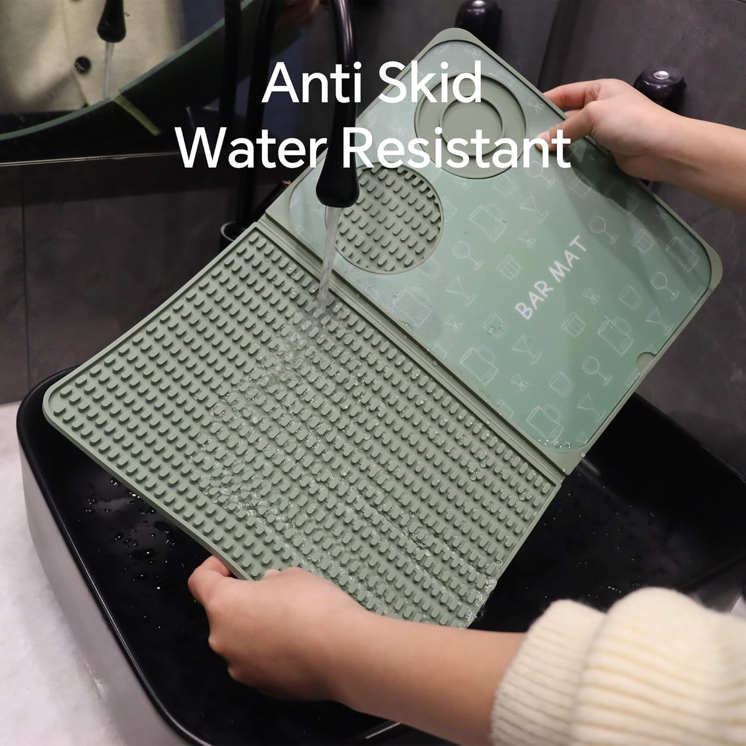 • MULTIFUNCTIONAL PROFESSIONAL BAR MAT - Silicone bar mat can be used for cutting fruit, garnishing glasses, mixing and pouring cocktails, this 3-in-1 drip mat protects your countertop and provides a designated cocktail prep area.