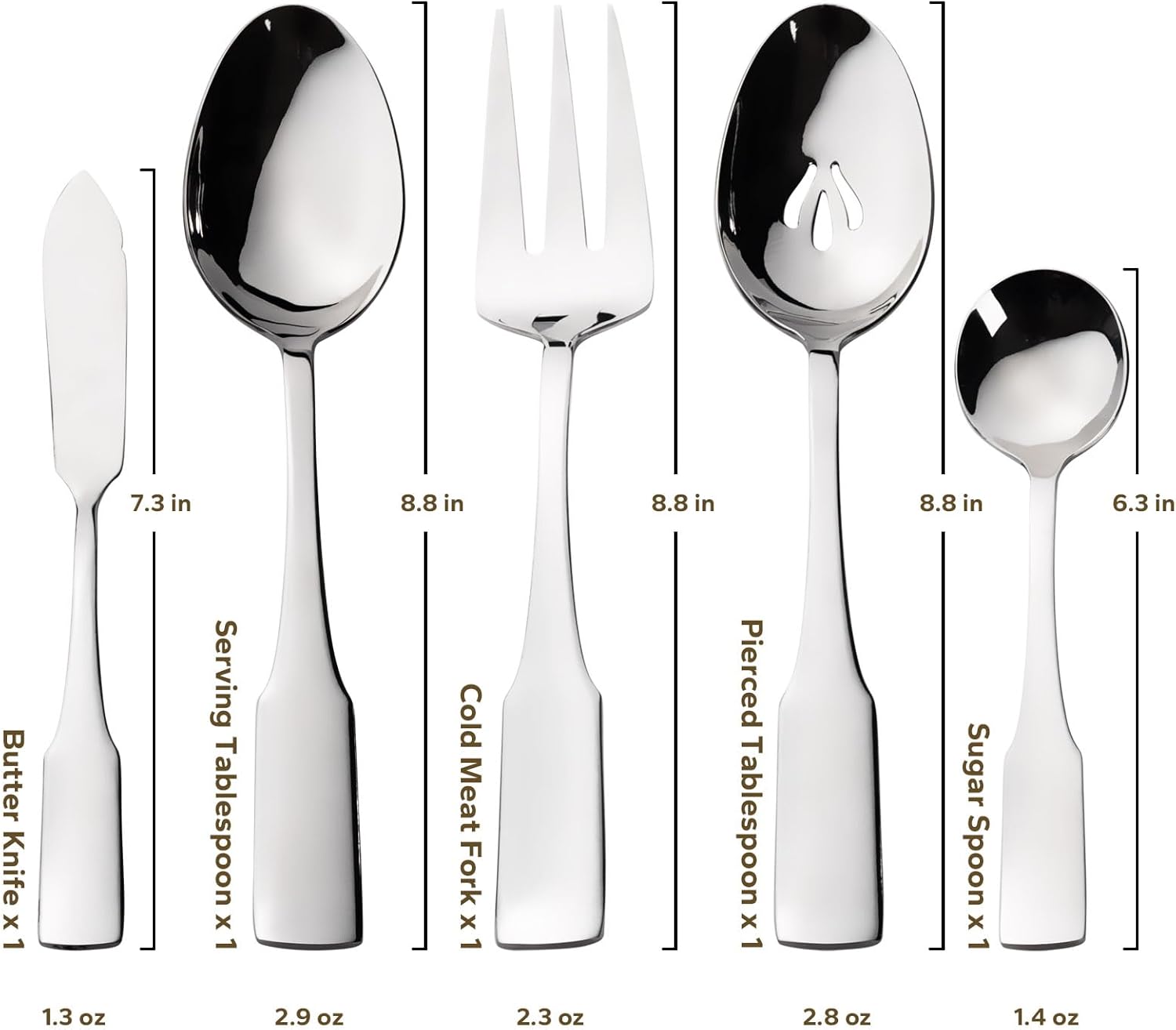 • INCLUDES: 65-piece flatware set with service for 12. Includes 12 each: dinner knife, dinner fork, salad fork, dinner spoon and teaspoon. Plus 1 each:serving tablespoon, pierced tablespoon, cold meat fork, butter knife, and sugar spoon