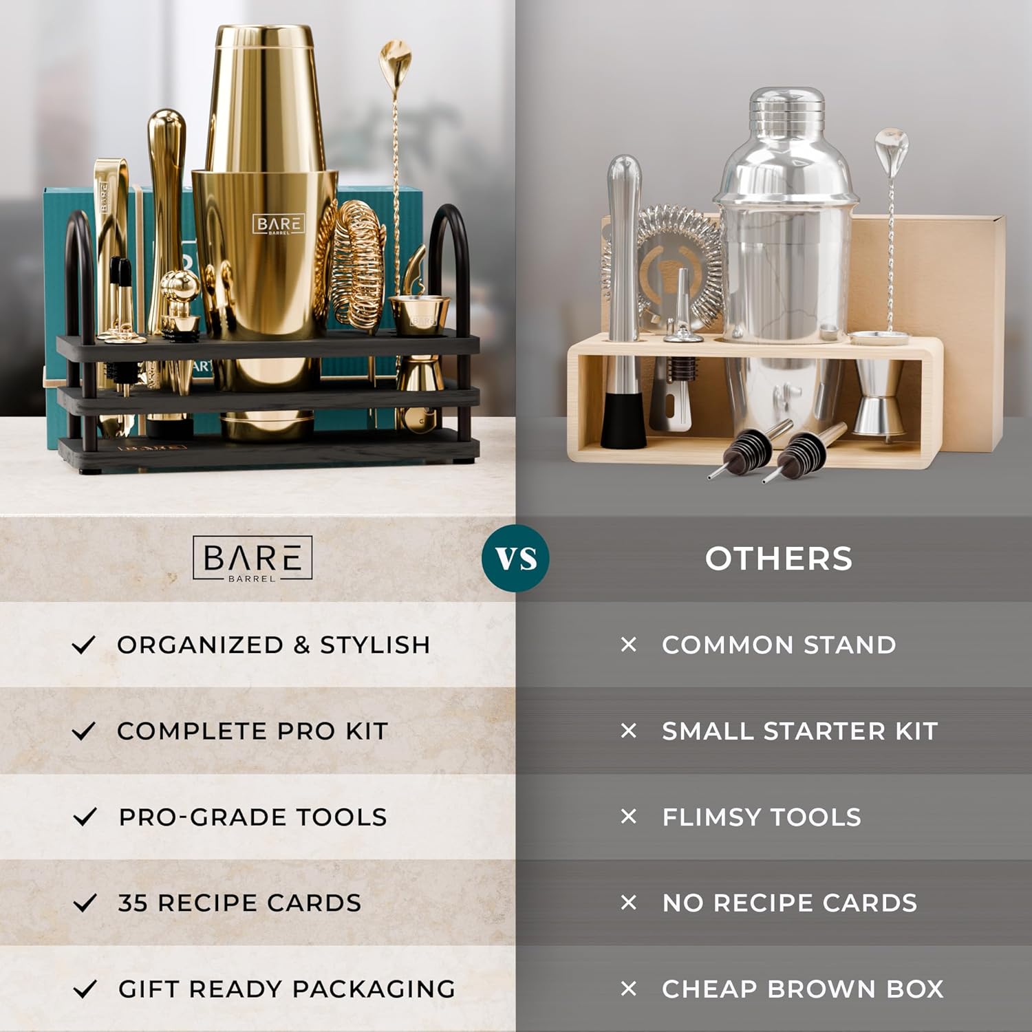 BARE BARREL® Mixology Bartender Kit Bar Set | 14-Piece Cocktail Shaker Set | Martini Barware Mixing Tools for Home Bartending | 35 Recipe Cards | Gift Set (28oz Boston Shaker, Gold/Black)