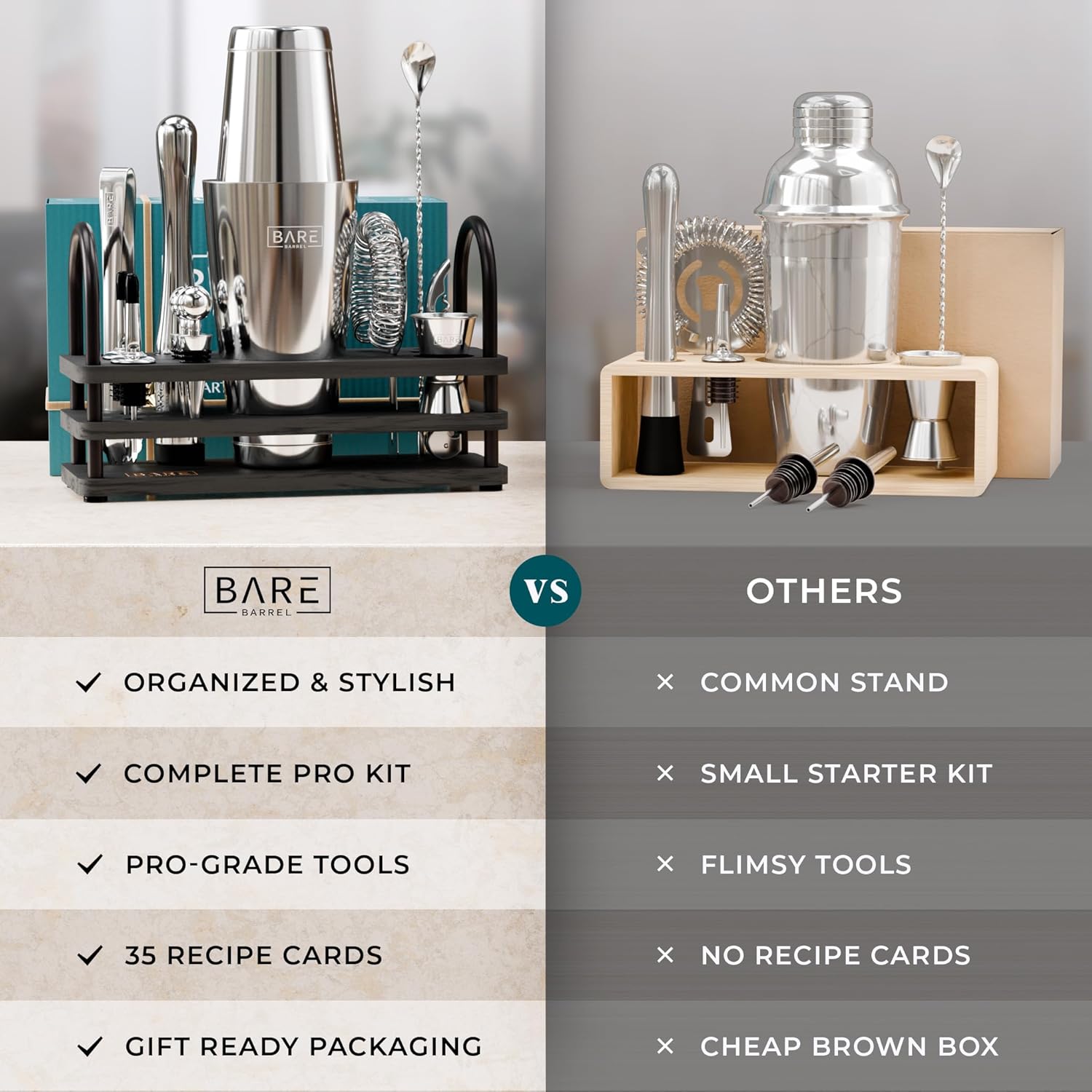BARE BARREL® Mixology Bartender Kit Bar Set | 14-Piece Cocktail Shaker Set | Martini Barware Mixing Tools for Home Bartending | 35 Recipe Cards | Gift Set (28oz Boston Shaker, Silver/Black)