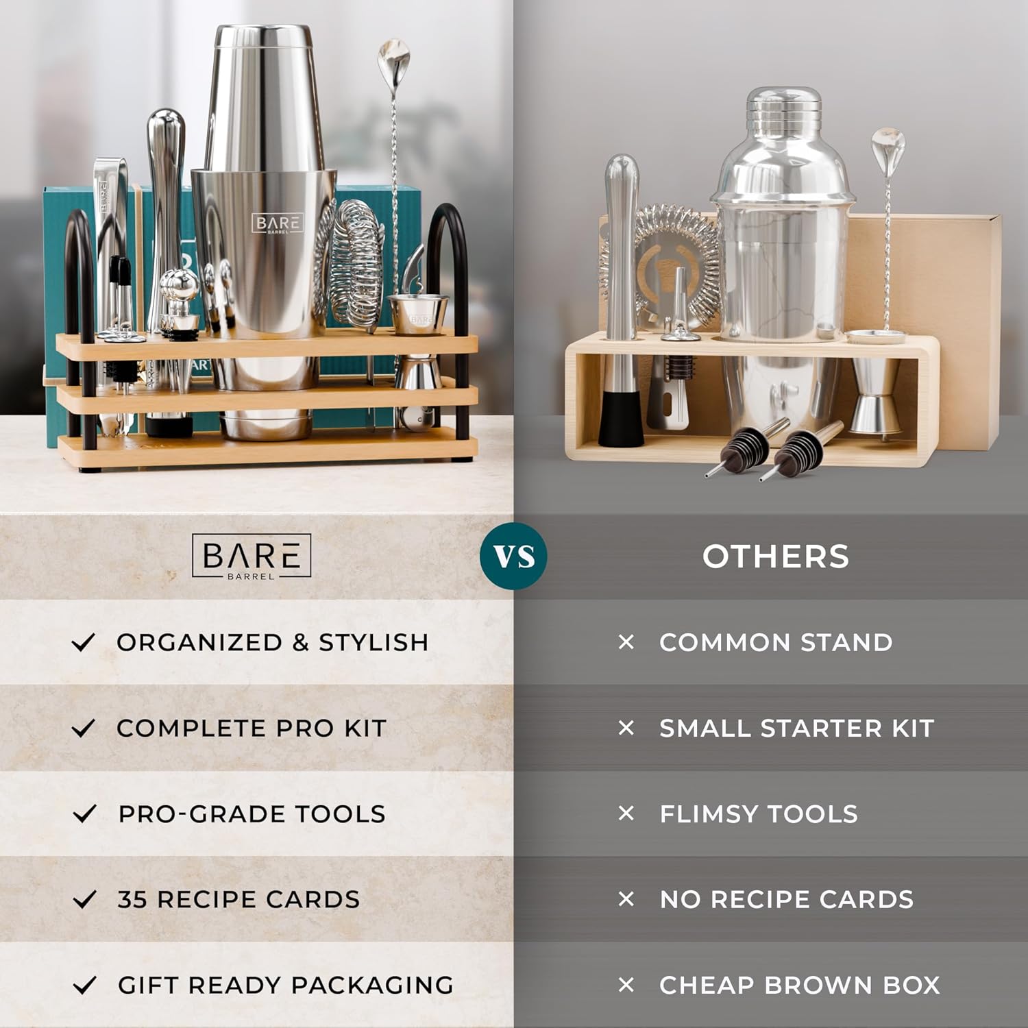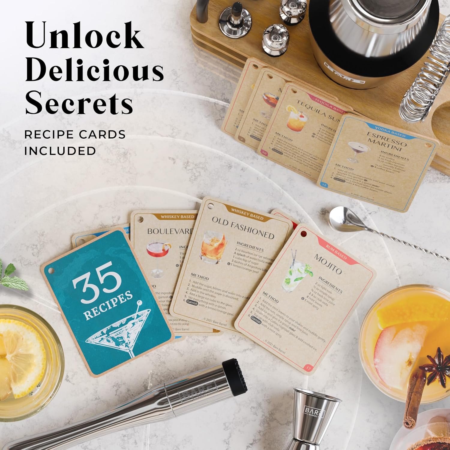 BARE BARREL® Mixology Bartender Kit Bar Set | 14-Piece Cocktail Shaker Set | Martini Barware Mixing Tools for Home Bartending | 35 Recipe Cards | Gift Set (28oz Boston Shaker, Silver/Natural)