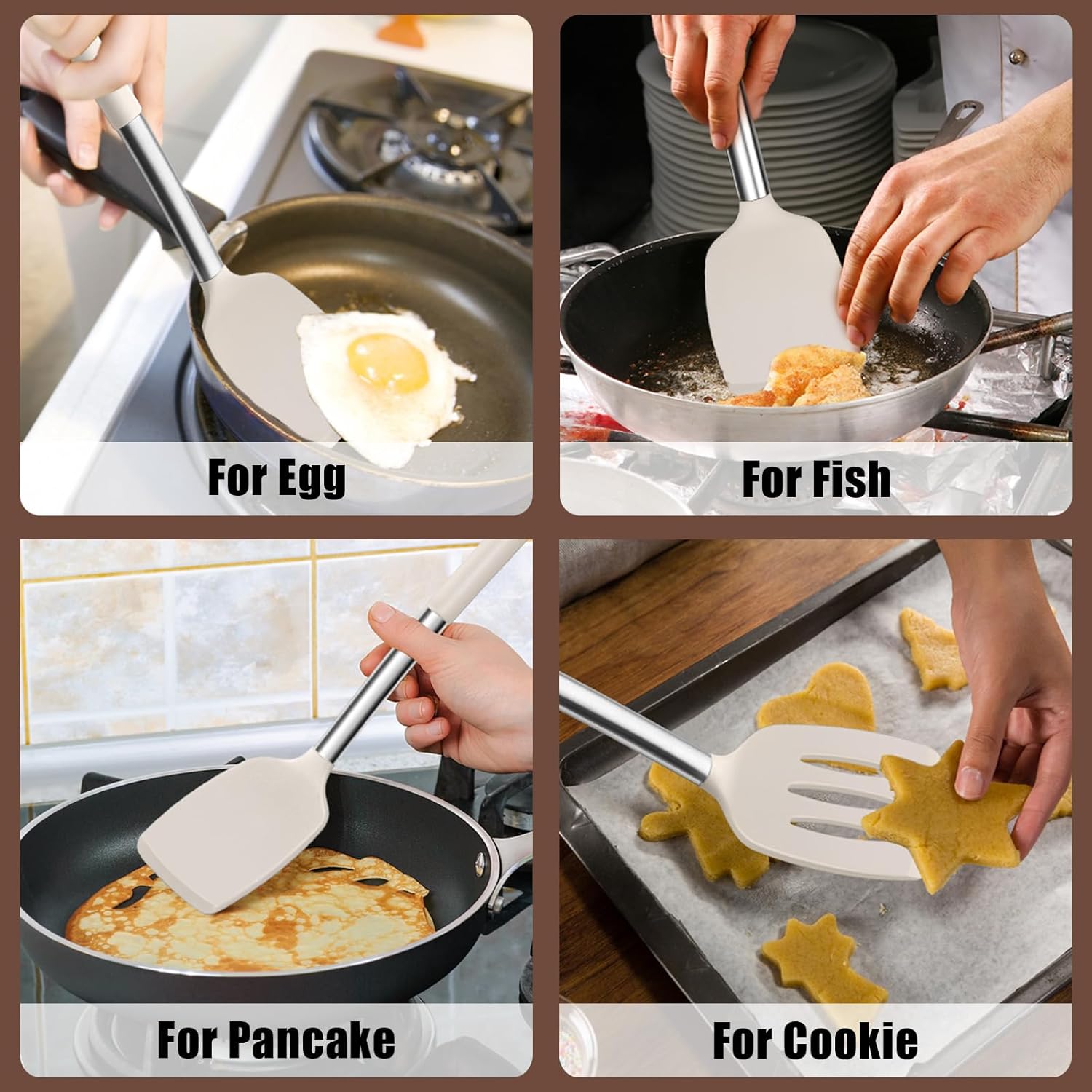 • NON-STICK COOKWARE FRIENDLY - Those silicone turners feature a flexible head and a soft surface that is gentle on your cookware, Won’t scratch, chip or harm those potentially dangerous non-stick pots and pans, Perfect tool to extend the life of your cookware, Ensure you have a safe and pleasant cooking journey
