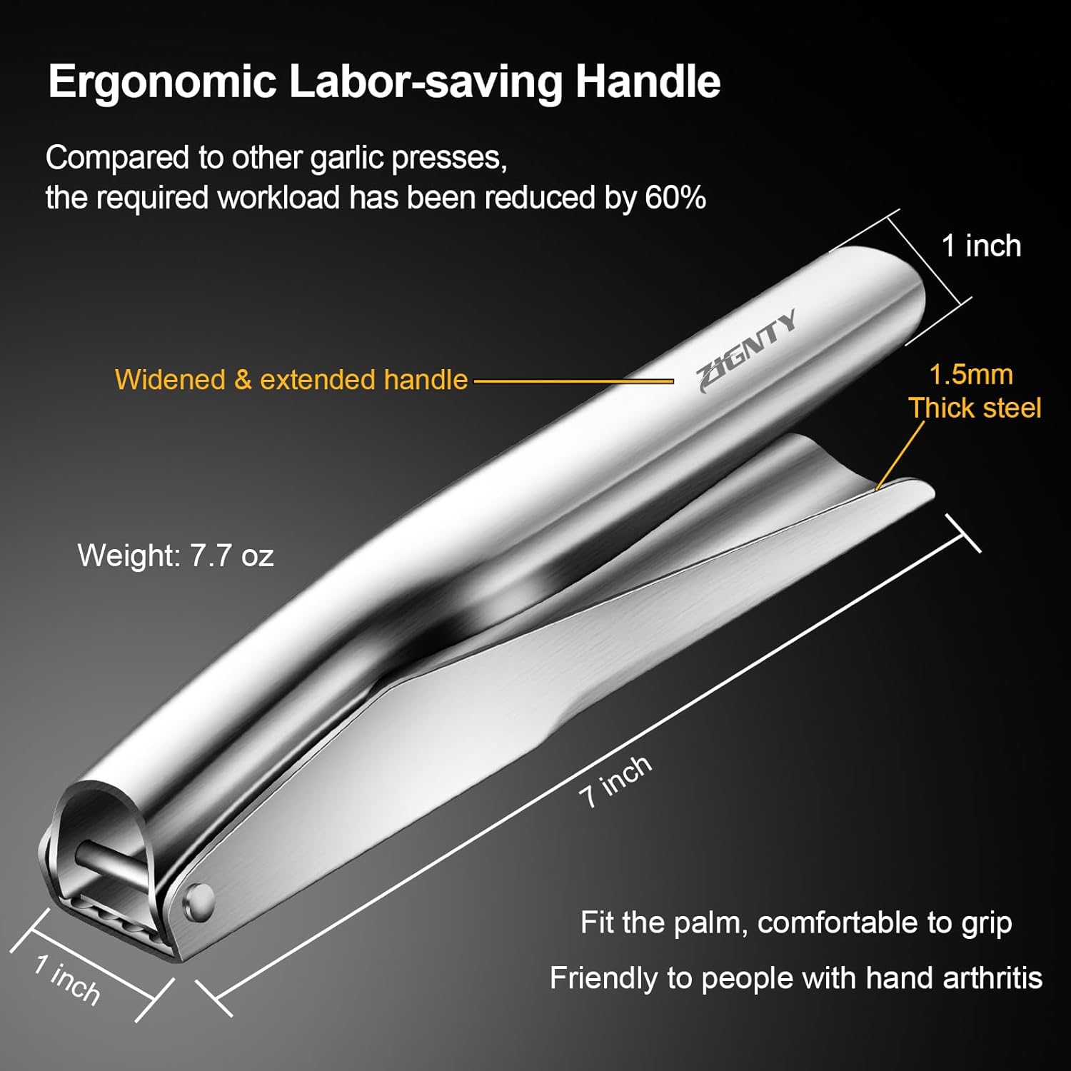 • 【Professional Garlic Press Set】The secret to making dishes salivate — Take ZIGNTY the best garlic press mincer home. Contains 1 garlic crusher stainless steel, 1 silicone garlic peeler and 1 brush.