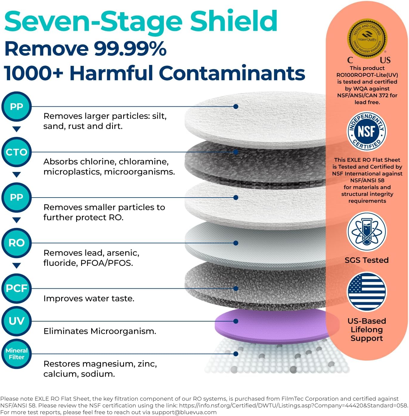 • SPACE-SAVING DESIGN AND YEARLY MAINTENANCE: The ROPOT-Lite(UV) is engineered for efficiency and convenience, offering 7-stage UV reverse osmosis system in a compact form, ideal for 1-2 people, and now supports easy filter replacement once annually. Certified by WQA against NSF/ANSI/CAN 372 for lead-free and tested by SGS, it ensures high water quality. Enjoy pure, healthy water that fits seamlessly into your living space.