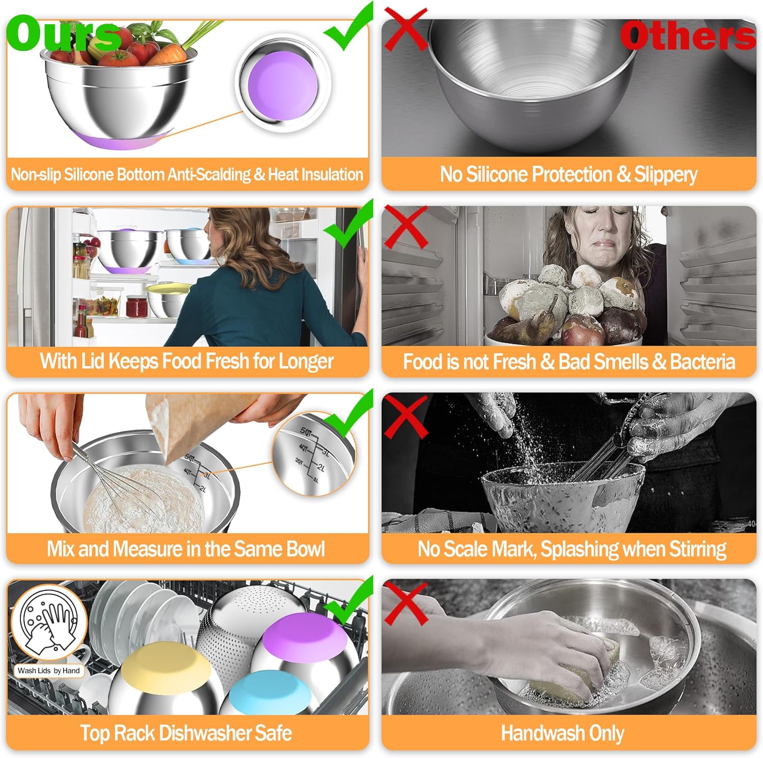 • 【Stainless Steel Material】: Our cooking utensils nesting mixing bowls are made of heavy-duty stainless steel, corrosion-resistant, rust-proof, and do not produce spots. The mixing bowl stainless steel adopts mirror polishing technology and smooth finish. The kitchen accessories are perfect for everyday use, such as making quick salads, prepping meals, mixing batters or storing and marinating foods.