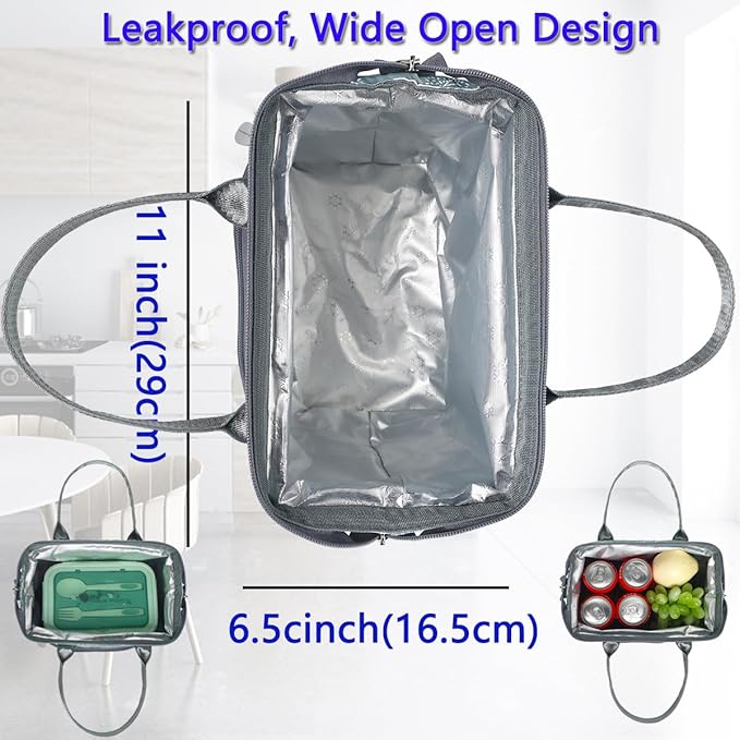 • ✿ Wide-Open Design & Large Size: Our women bag can be opened up to 11"L x 6.5"W by dual zipper closure, you can put into or take out of your lunch or other kinds of stuff horizontally, avoid spilling soup or liquid in the bag. The dimension is:11” L×6.5” W×11” H,it could give roomy storage space you need to hold your favorite meals, delis, and lunch treat. You could fill the compartments or pockets with lunch boxes, food containers, condiments, fruit salad bowls and other essentials.