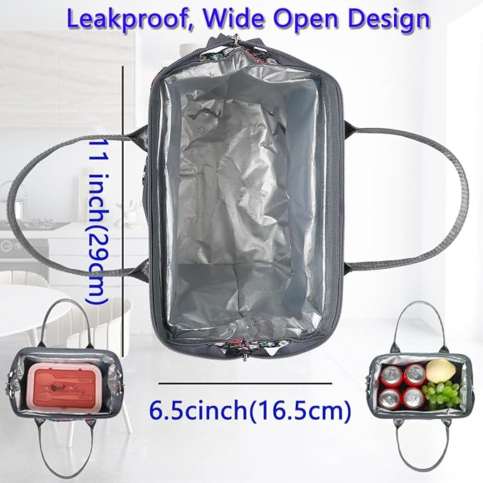 • ✿ Wide-Open Design & Large Size: Our women bag can be opened up to 11"L x 6.5"W by dual zipper closure, you can put into or take out of your lunch or other kinds of stuff horizontally, avoid spilling soup or liquid in the bag. The dimension is:11” L×6.5” W×11” H,it could give roomy storage space you need to hold your favorite meals, delis, and lunch treat. You could fill the compartments or pockets with lunch boxes, food containers, condiments, fruit salad bowls and other essentials.