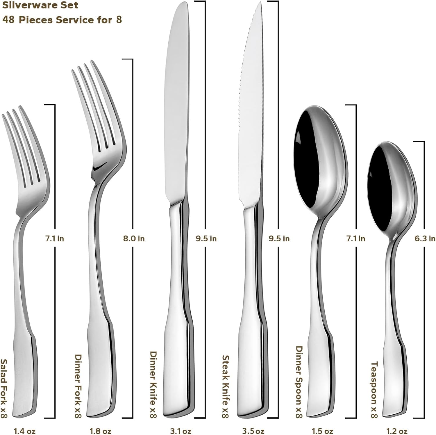 • INCLUDES: 48-piece flatware set with service for 8. Includes 8 each: dinner knife, steak knife, dinner fork, salad fork, dinner spoon and teaspoon