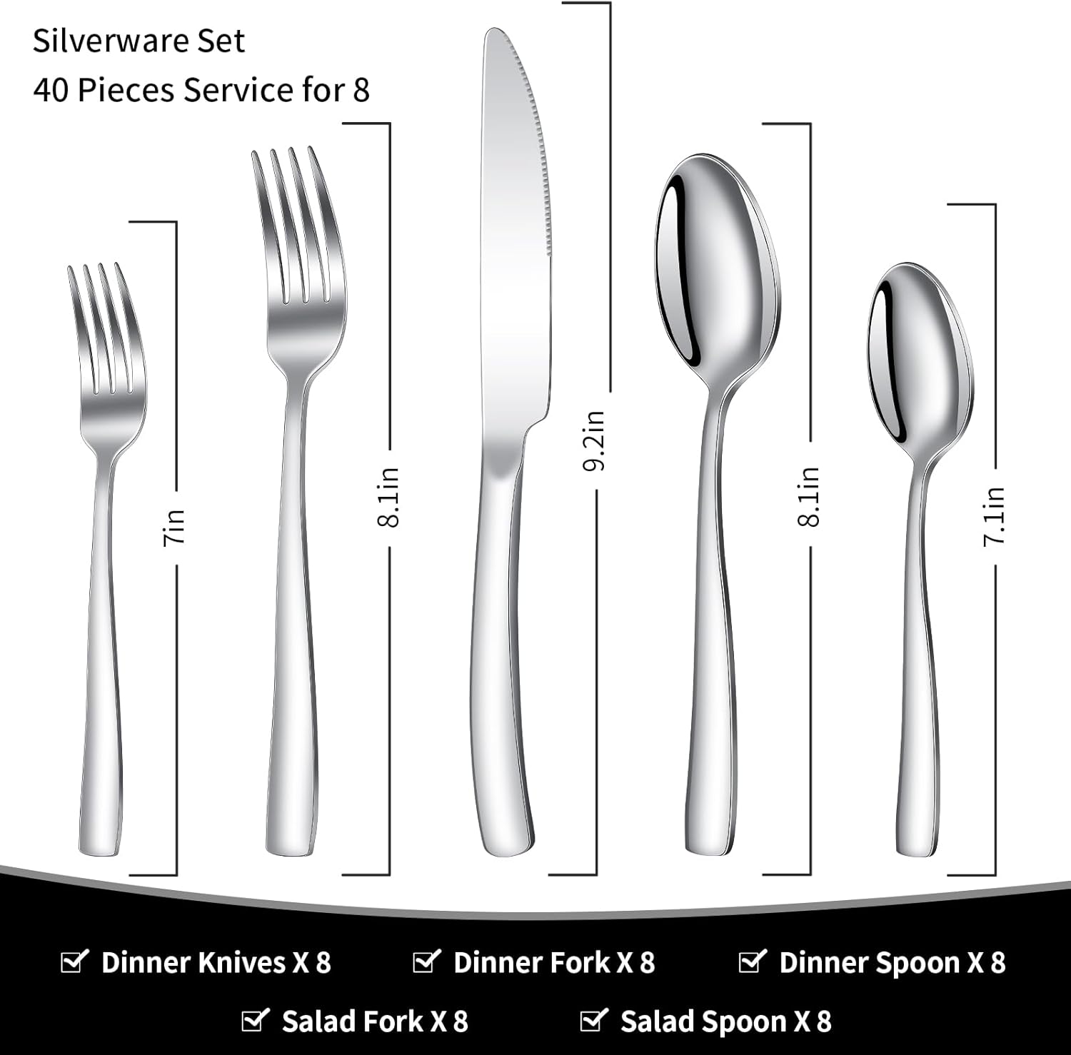 • Silverware Set For 8: This 40-piece stainless steel flatware set includes 8 dinner forks, dinner spoons, dinner knives, salad forks and teaspoons. Ideal for everyday use, home, kitchen, restaurant serving and more.