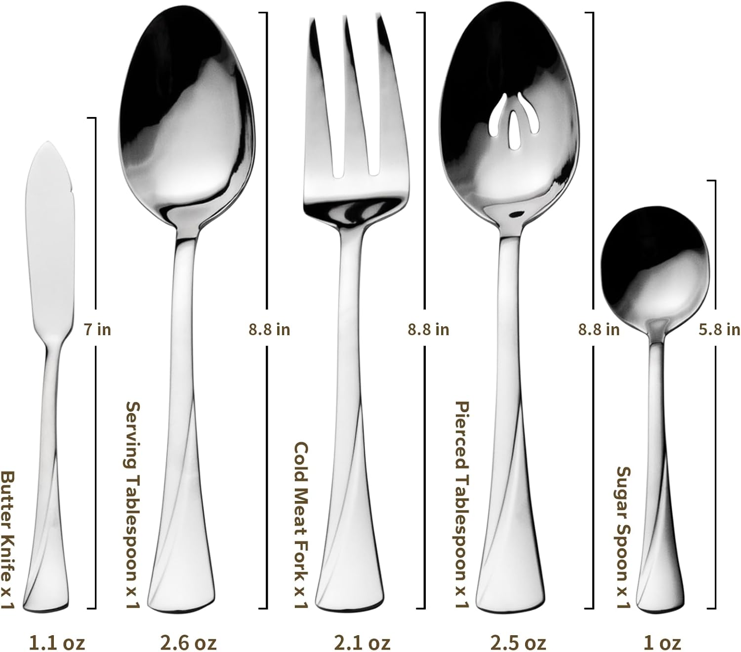 • INCLUDES: 65-piece flatware set with service for 12. Set includes 12 each: dinner knife, dinner fork, salad fork, dinner spoon and teaspoon. Plus 1 each:serving tablespoon, pierced tablespoon, cold meat fork, butter knife, and sugar spoon
