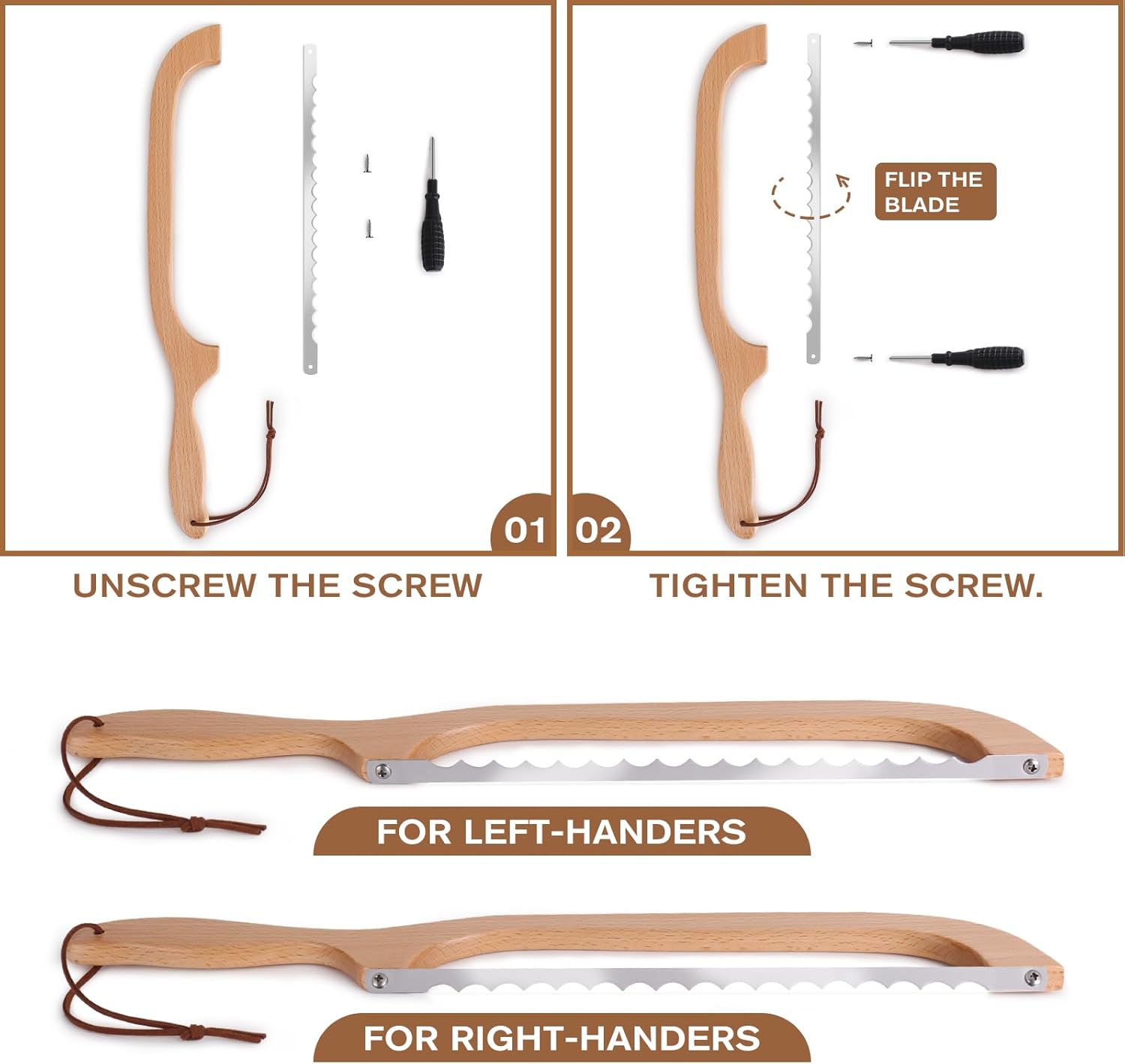 • [Tighten the Screws] The bread bow knife arrives pre-assembled from the factory. However, if you notice blade wobbling affecting its bread-cutting performance, simply use a screwdriver to tighten the screws on both sides of the blade, this adjustment will enhance its effectiveness.