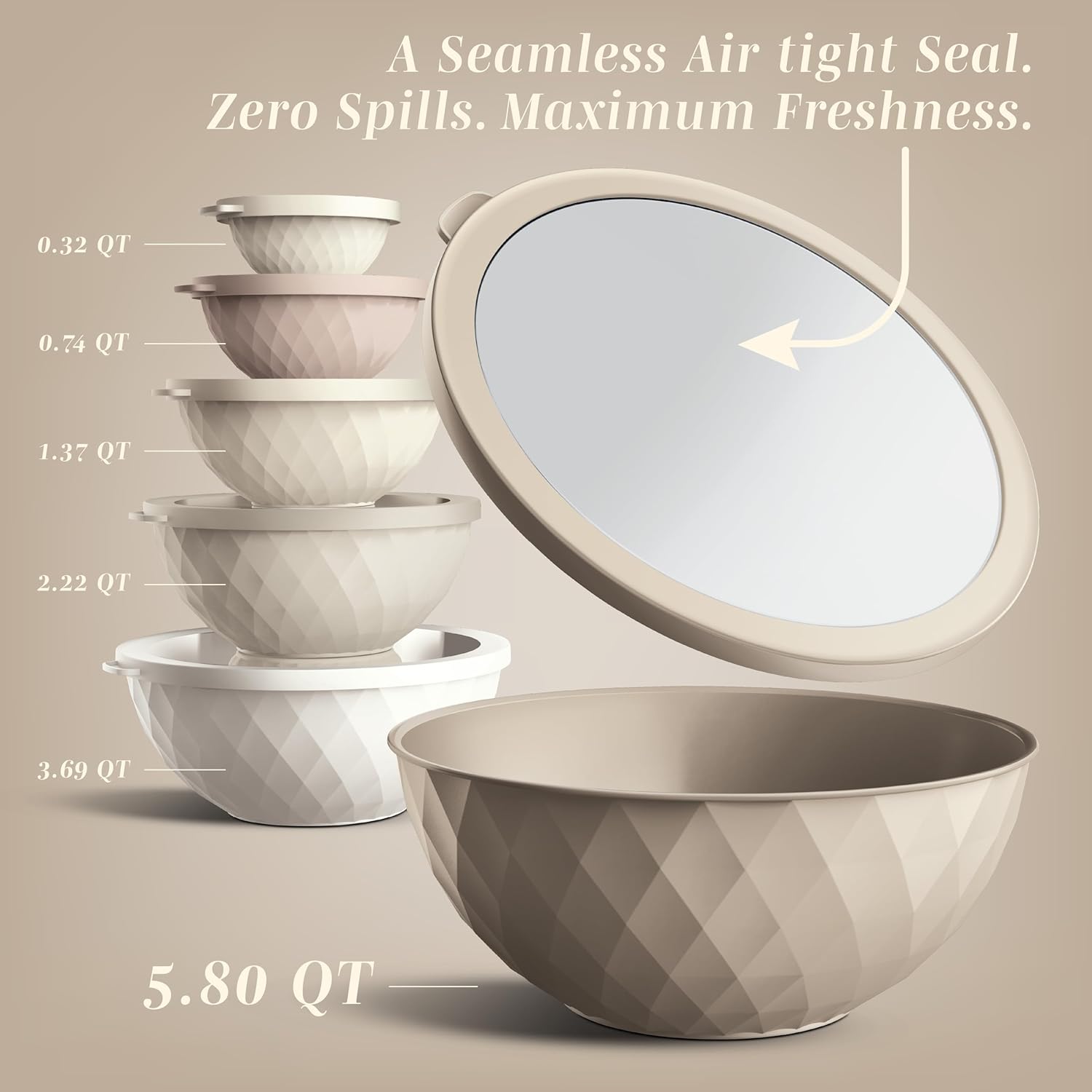 • Set includes 6 plastic bowls and 6 TPR lids; Bowl capacity of 0.32 QT, 0.74 QT, 1.37 QT, 3.69 QT and 5.8 QT.