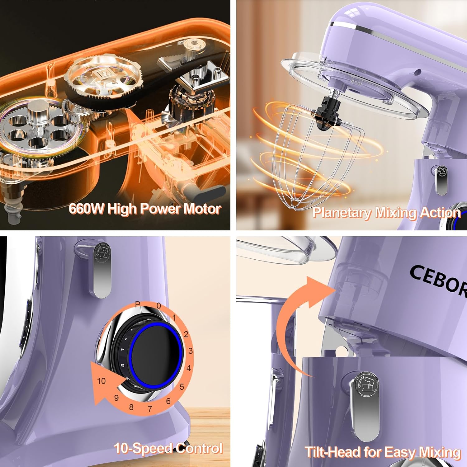 • 🍞Versatile & Efficient : CEBORY kitchen mixer boasts a multitude of functions, mixing, kneading and whisking. Featuring 10 and Pulse speed settings ranging from gentle stirring to high-speed blending - making it a powerful ally for all your culinary endeavors,such as, cakes, bread, cookies, pastry, muffins, and waffles.