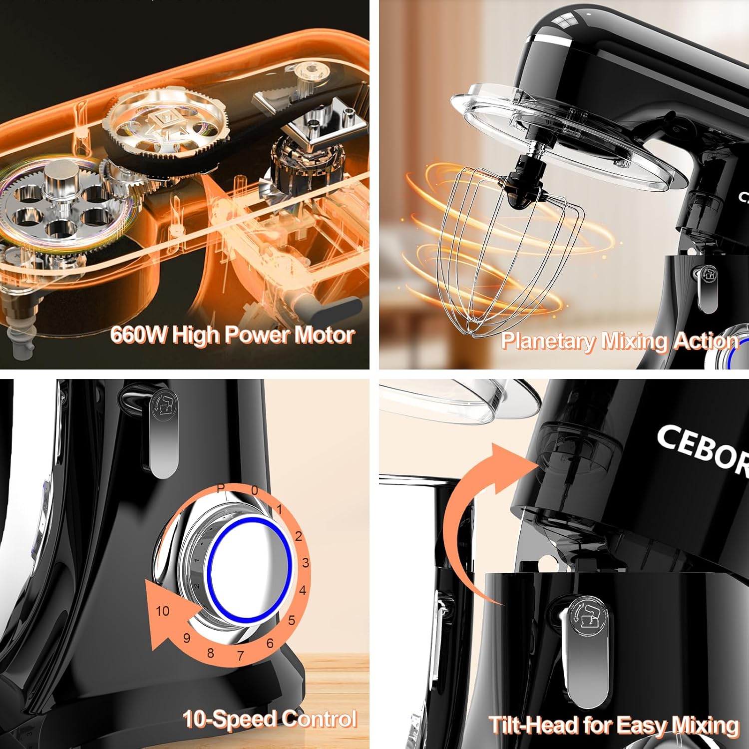 • 🍞Versatile & Efficient : CEBORY kitchen mixer boasts a multitude of functions, mixing, kneading and whisking. Featuring 10 and Pulse speed settings ranging from gentle stirring to high-speed blending - making it a powerful ally for all your culinary endeavors,such as, cakes, bread, cookies, pastry, muffins, and waffles.