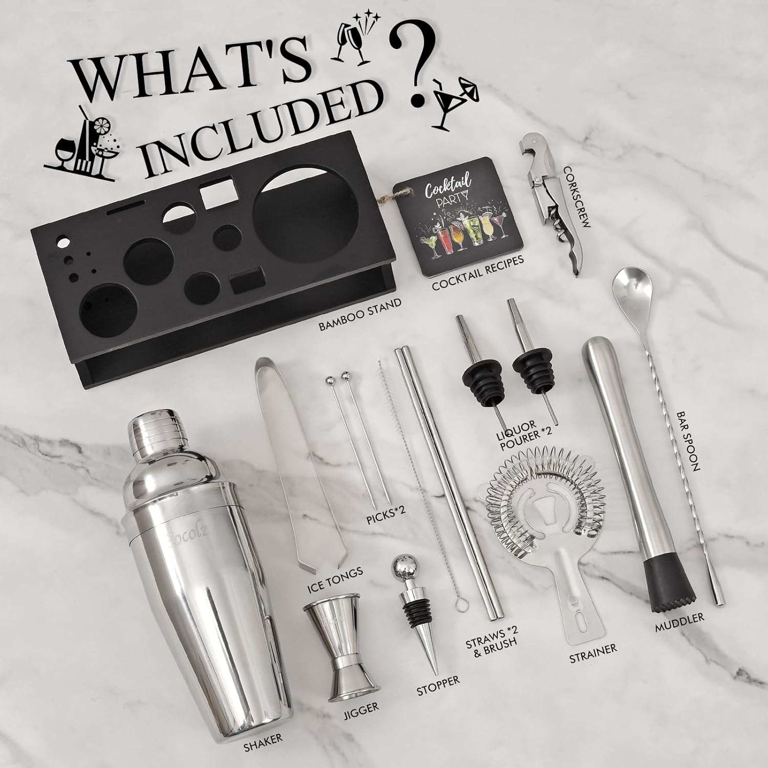 • Make Drinks Professional Tool Set: This 17-piece cocktail shaker set contains most essential bartending tools needed for start mixing drinks, 25 oz martini shaker, double jigger, bar spoon, muddler, strainer, ice tongs, liquor pourers, corkscrew, straws with brush, stopper, picks, Recipes and stand